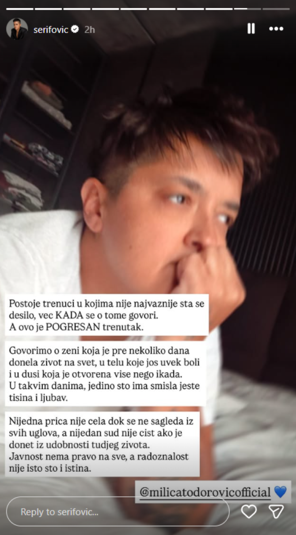 "Postoje trenuci u kojima nije najvažnije šta se desilo, već kada se o tome govori. A ovo je pogrešan trenutak. Govorimo o ženi koja je pre nekoliko dana donela život na svet, u telu koje još uvek boli i u duši koja je otvorena više nego ikada. U takvim danima jedino što ima smisla jesu tišina i ljubav. Nijedna priča nije potpuna dok se ne sagleda iz svih uglova, a nijedan sud nije čist ako je donet iz udobnosti tuđeg života. Javnost nema pravo na sve, a radoznalost nije isto što i istina", poručila je Marija.