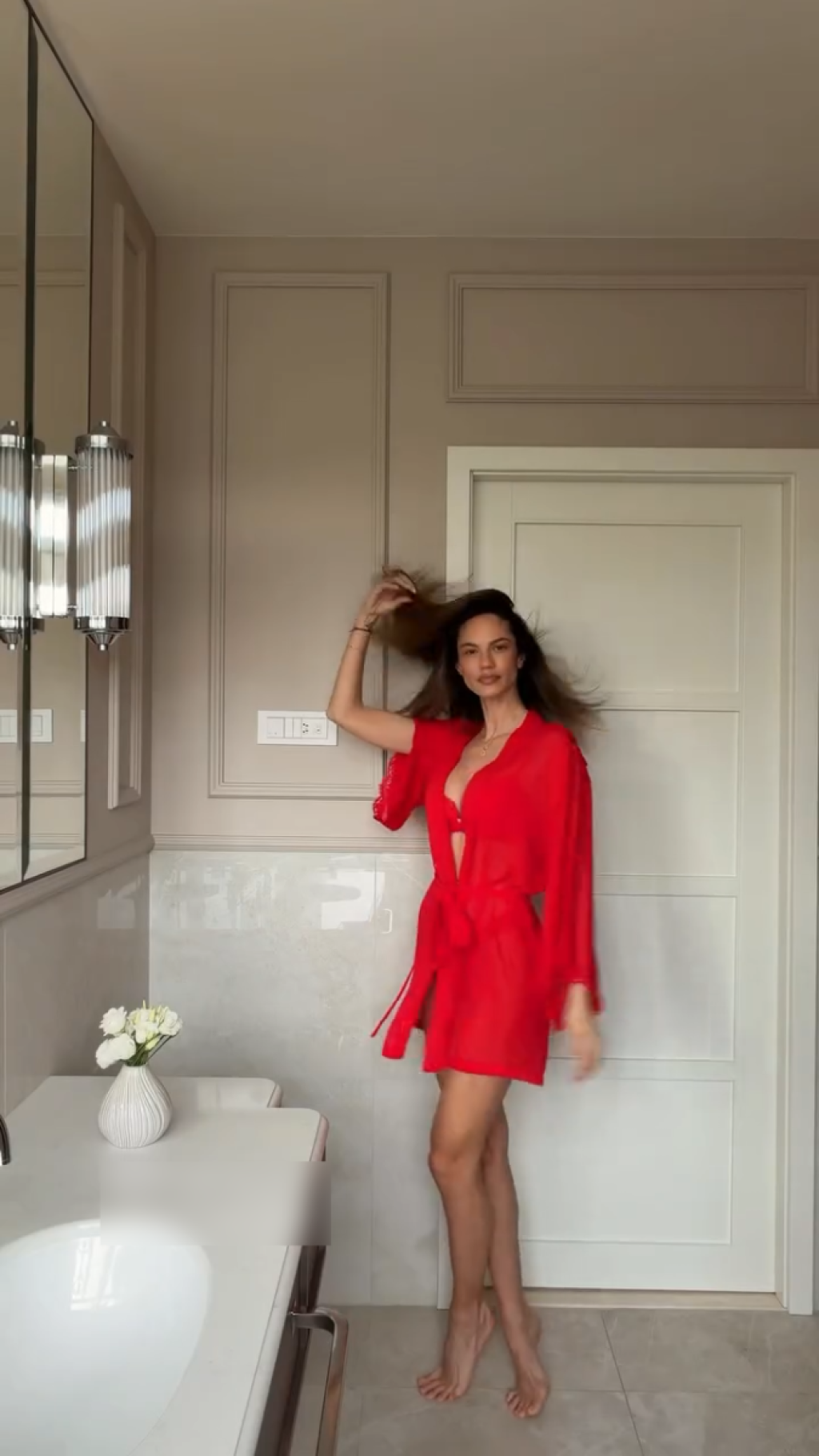 U poslednjem objavljenom snimku, Dimitrovska je pozirala u crvenom bade-mantilu i sofisticiranom donjem vešu, kombinujući eleganciju i zavodljivost.