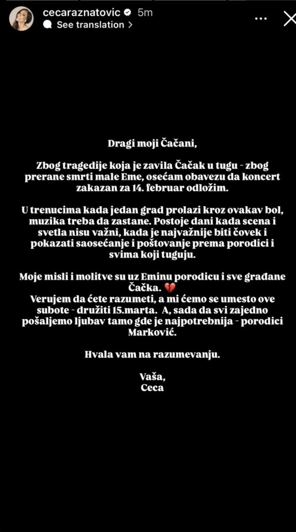 "Dragi moji Čačani, zbog tragedije koja je zavila Čačak u tugu, zbog prerane smrti male Eme, osećam obavezu da koncert zakazan za 14. februar odložim. U trenucima kada jedan grad prolazi kroz ovakav bol, muzika treba da zastane. Postoje dani kada scena i svetla nisu važni, kada je najvažnije biti čovek i pokazati saosećanje i poštovanje prema porodici i svima koji tuguju. Moje misli i molitve su uz Eminu porodicu i sve gradane Čačka", napisala je Ceca i dodala: