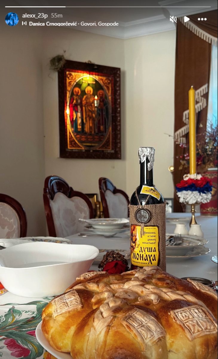 Aleksandra je na Instagramu objavila fotografiju iz kuće na kojoj se vidi svečano postavljena trpeza. Na stolu su slavski kolač, upaljena sveća, vino, praznične salvete i pažljivo aranžiran escajg, dok se na zidu ističe velika ikona.