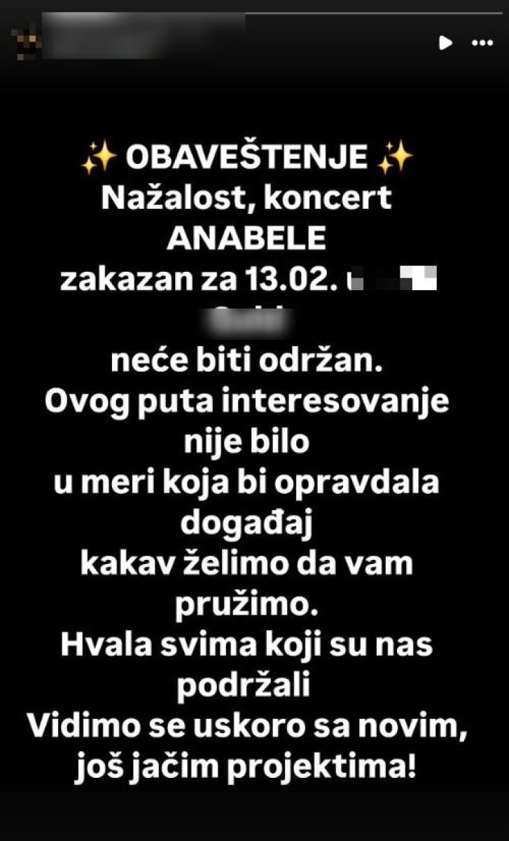 "Obaveštenje! Nažalost, koncert Anabele zakazan za 13. februar neće biti održan. Ovog puta interesovanje nije bilo u meri koja bi opravdala događaj kakav želimo da vam pružimo", navodi se u saopštenju o nastupu pevačice koja je nedavno proslavila 51. rođendan.