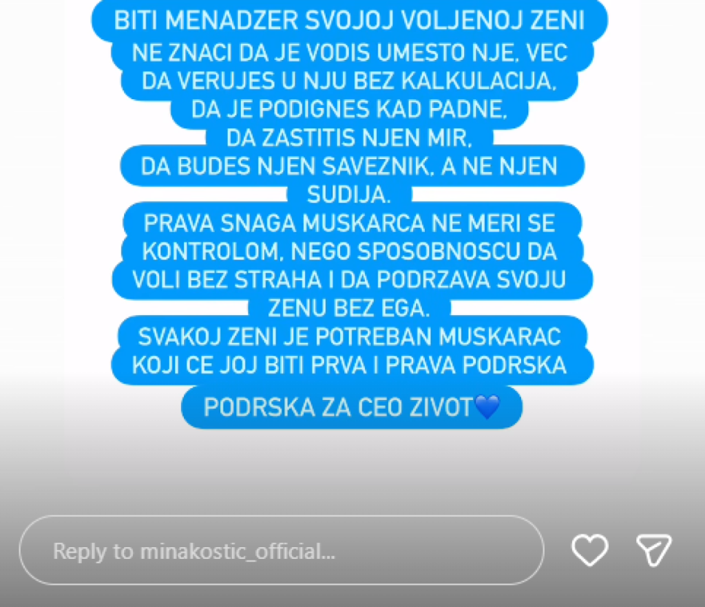 Mina je na Instagram profilu podelila objavu svog izabranika, koji se trenutno nalazi u Americi, a u kojoj je otkrio šta za njega znači nova uloga i kakav odnos želi da gradi sa pevačicom.