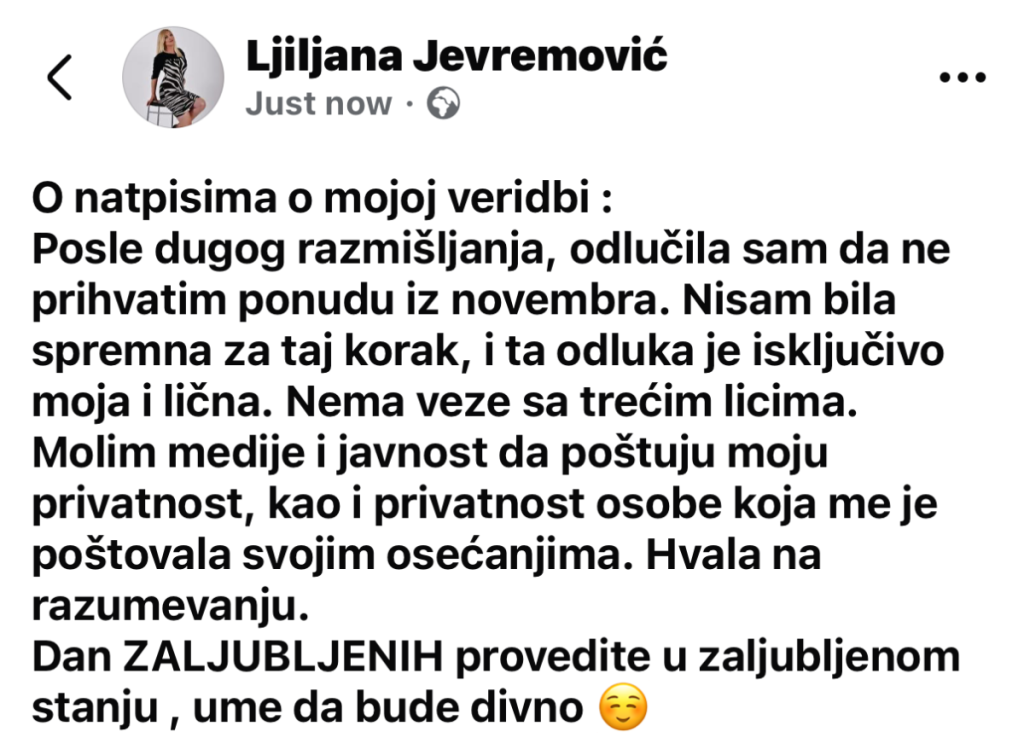 "O natpisima o mojoj veridbi: Posle dugog razmišljanja, odlučila sam da ne prihvatim ponudu iz novembra. Nisam bila spremna za taj korak, i ta odluka je isključivo moja i lična. Nema veze sa trećim licima. Molim medije i javnost da poštuju moju privatnost, kao i privatnost osobe koja me je poštovala svojim osećanjima. Hvala na razumevanju. Dan zaljubljenih provedite u zaljubljenom stanju, ume da bude divno ", napisala je Ljiljana.