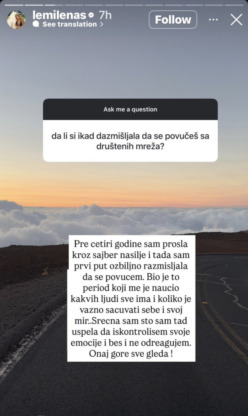"Pre četiri godine sam prošla kroz sajber nasilje i tada sam prvi put ozbiljno razmišljala da se povučem. Bio je to period koji me je naučio kakvih ljudi sve ima i koliko je važno sačuvati sebe i svoj mir. Srećna sam što sam tad uspela da iskontrolišem svoje emocije i bes i ne reagujem. Onaj gore sve gleda", napisala je devojka Bake Praseta.