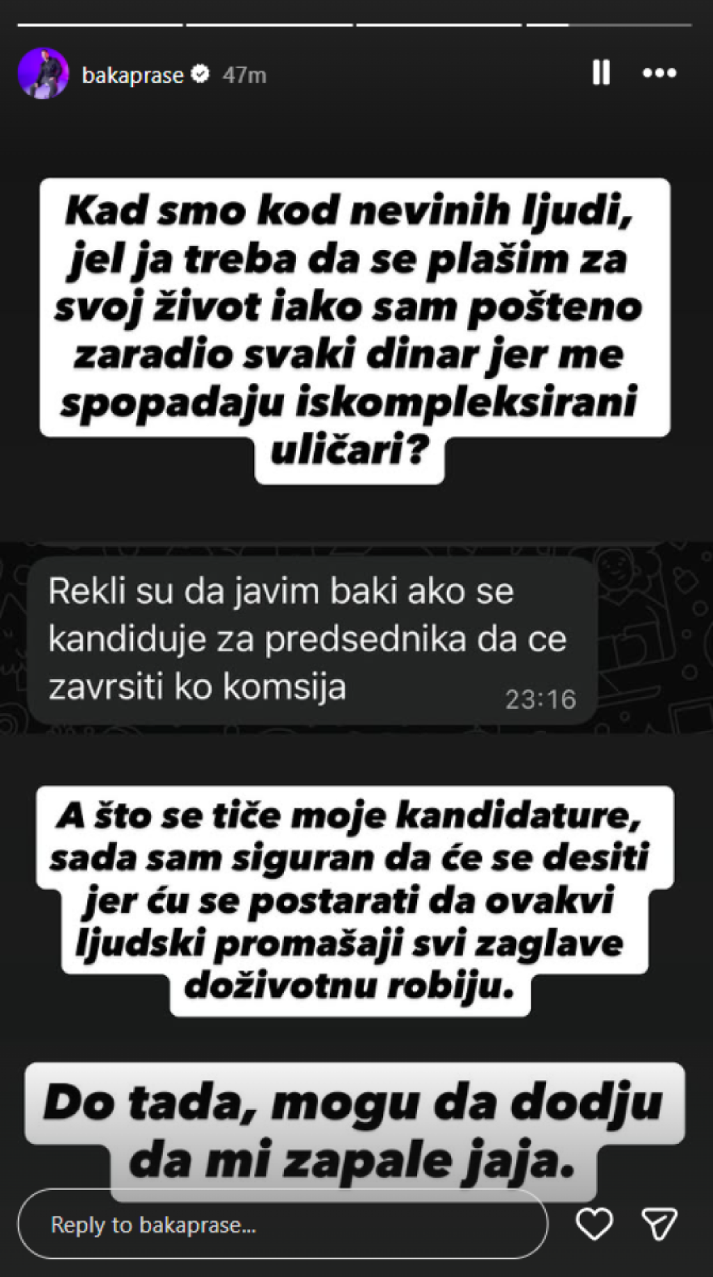 "Kad smo kod nevinih ljudi, je l' ja treba da se plašim za svoj život iako sam pošteno zaradio svaki dinar, jer me spopadaju iskompleksirani uličari? Što se tiče moje kandidature, sada sam siguran da će se desiti jer ću se postarati da ovakvi ljudski promašaji svi zaglave doživotnu robiju. Do tada, mogu da dođu da mi zapale jaja."