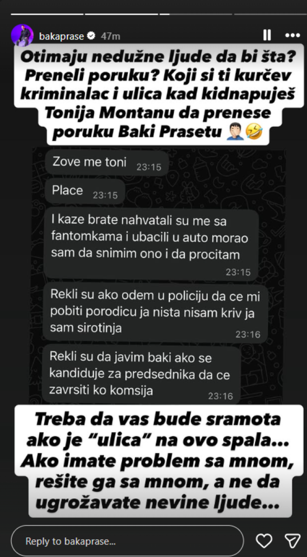 "Ovim ljudima nije jasno da otimaju nedužne ljude samo da bi preneli poruku? Koji si ti kriminalac i 'ulica' kad kidnapuješ Tonija Montanu da prenese poruku Baki Praseu. Treba da vas bude sramota ako je 'ulica' na ovo spala. Ako imate problem sa mnom, rešite ga sa mnom, a ne da ugrožavate nevine ljude."