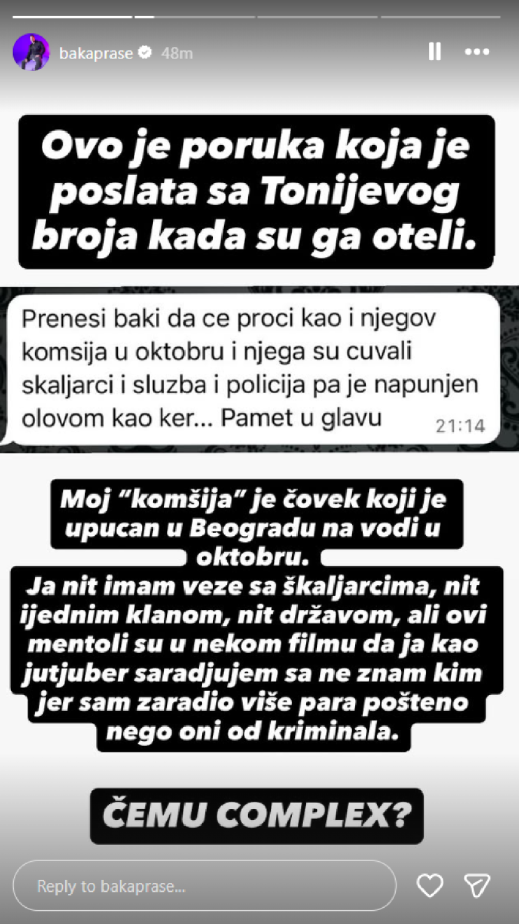 Samo nekoliko dana nakon što mu je zapaljen luksuzni "mercedes brabus", u nizu storija na društvenim mrežama, gde je podelio i printskrinove Vocap prepiski, Baka Prase je opisao sa kakvim se neprijatnostima susreće.