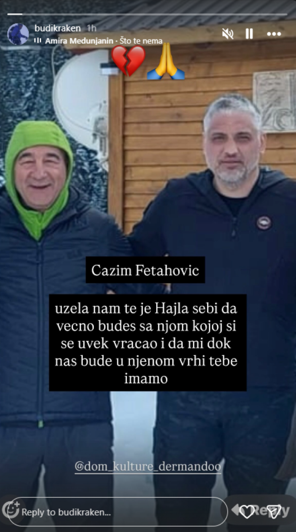 "Ćazim Fetahović... Hajla te je uzela sebi, da zauvek ostaneš s njom, planinom kojoj si se uvek vraćao, i da nas dok smo u njenim vrhovima uvek podsećaš na sebe", napisao je Jovanović, uz emotikon slomljenog srca i pesmu "Što te nema".
