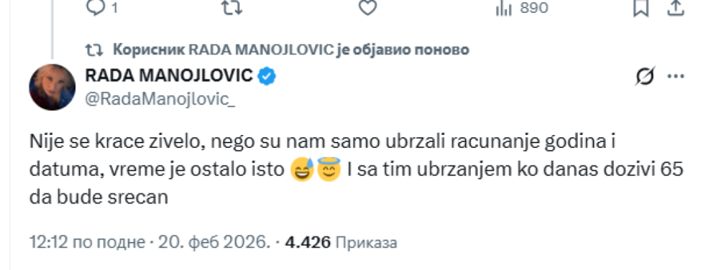 "Nije se kraće živelo, nego su nam samo ubrzali računanje godina i datuma, vreme je ostalo isto. I sa tim ubrzanjem ko danas doživi 65 da bude srećan", napisala je Rada.