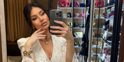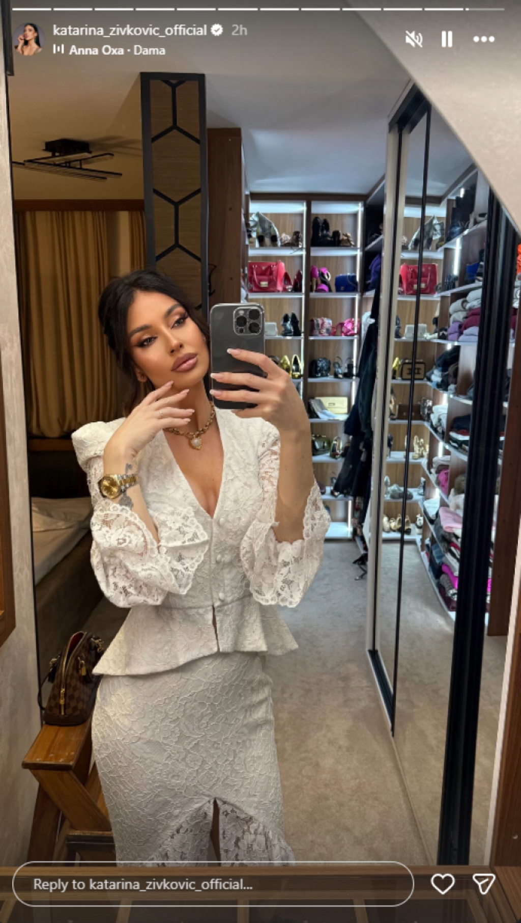 Kaća je pozirala ispred ogledala u belom čipkanom kompletu a iza nje je bio luksuzni i raskošni garderober, koji se nalazi u sklopu spavaće sobe.