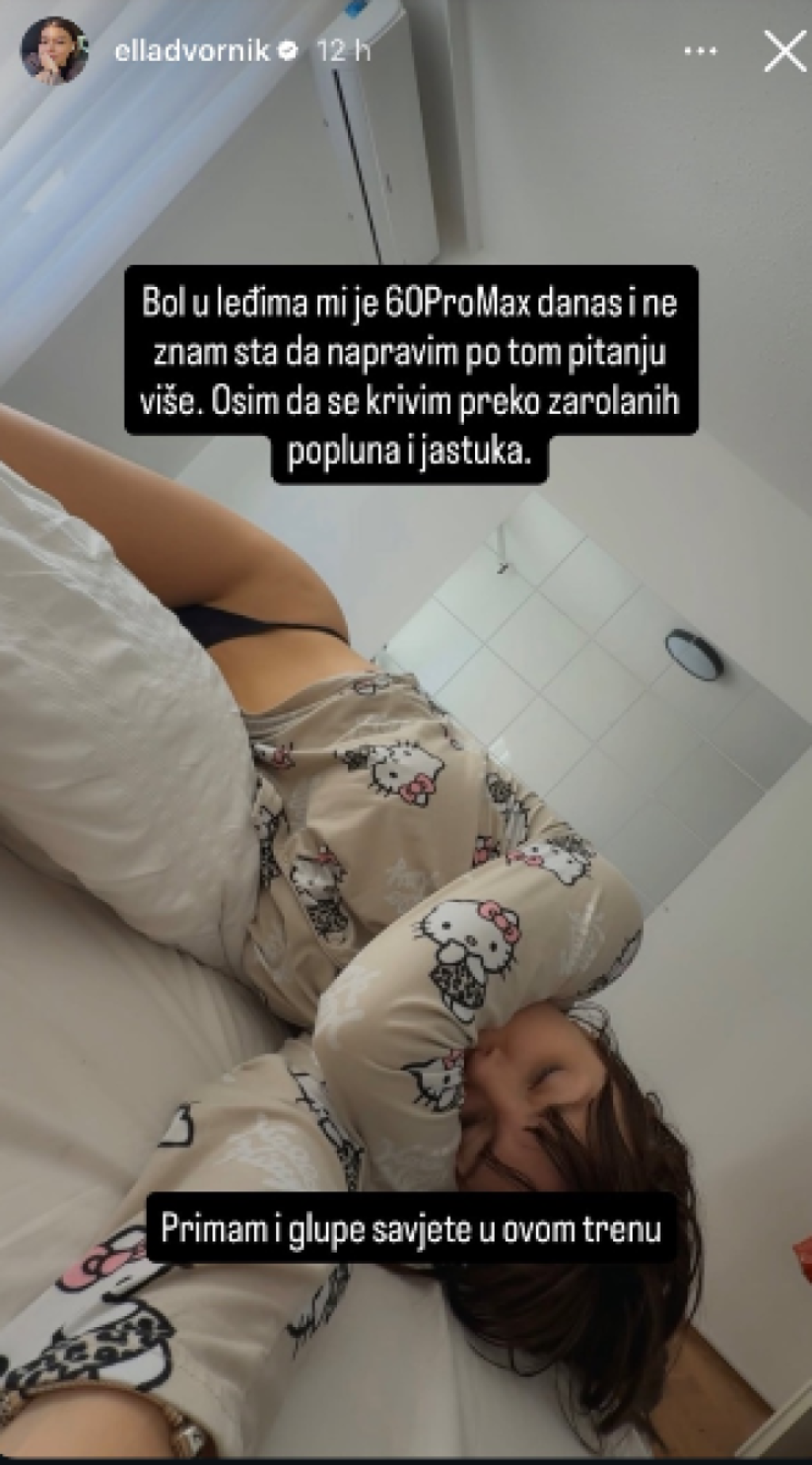 "Bol u leđima mi je 60 Pro Max danas i ne znam šta da uradim po tom pitanju više. Osim da se krivim preko zarolanih popluna i jastuka. Primam i glupe savete u ovom trenutku", napisala je ona uz fotku.