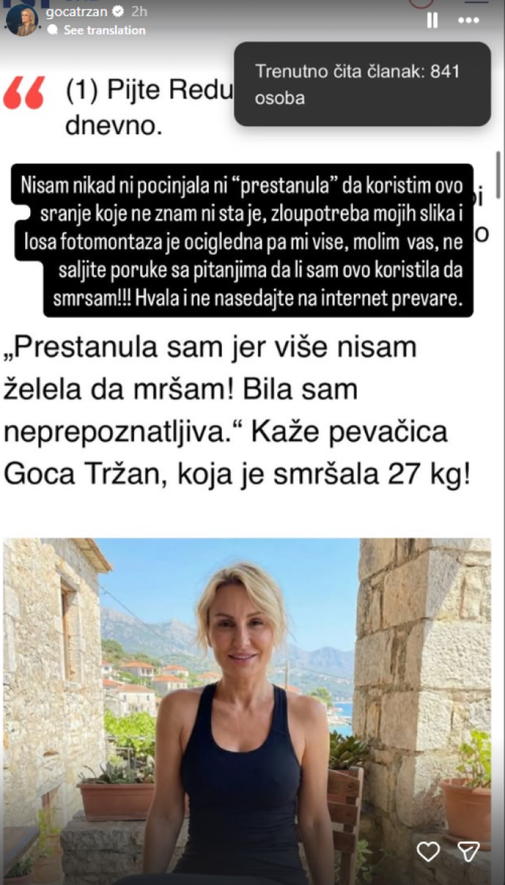 "Nisam nikad ni počinjala, ni ‘prestanula’ da koristim ovo sranje koje ne znam ni šta je. Zloupotreba mojih slika i loša fotomontaža su očigledne. Molim vas, nemojte mi više slati poruke sa pitanjima da li sam ovo koristila da bih smršala. I ne nasedajte na internet prevare", napisala je Tržanova.