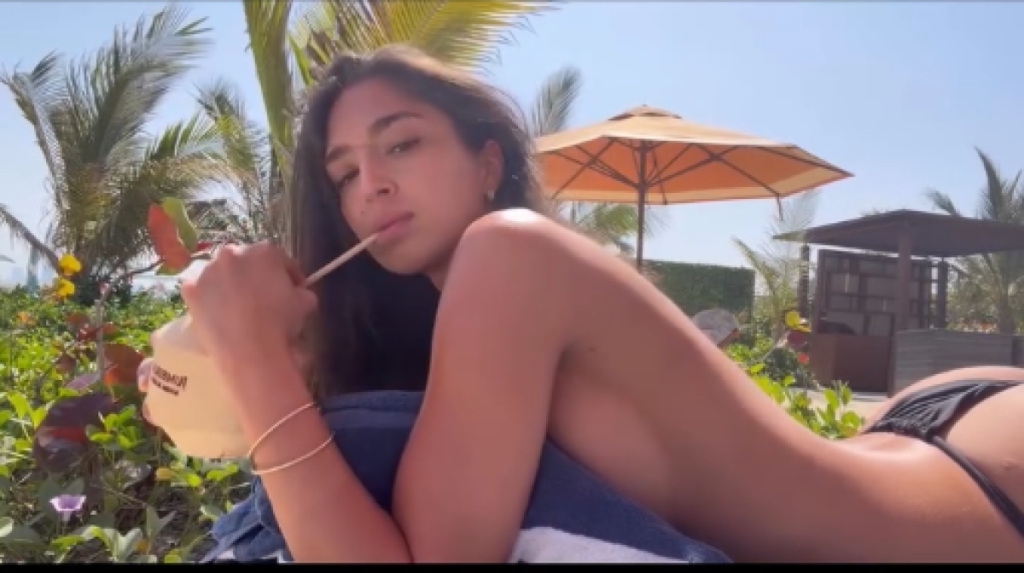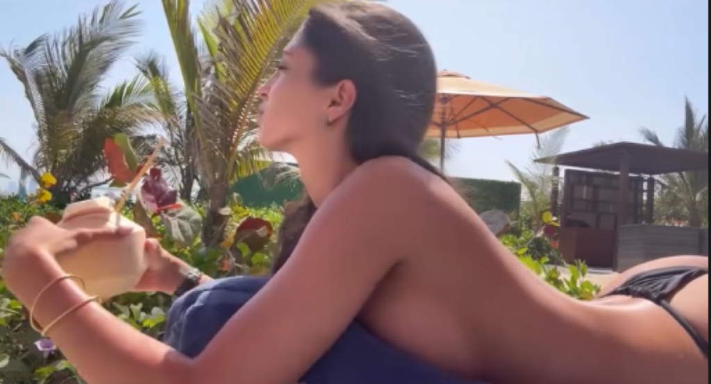 Đina je objavila je snimak iz Španije, gde se preselila zbog dečka, na kom leži, na ležaljci pored bazena, okrenuta na stomak, bez gornjeg dela kupaćeg kostima, dok je donji deo u minimalističnom kroju.