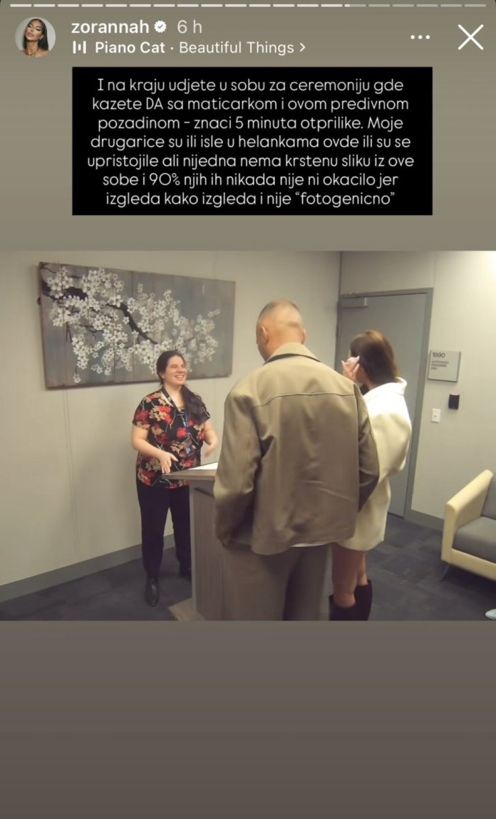 "I na kraju uđete u sobu za ceremonju gde kažete DA sa matičarkom i ovom predivnom pozadinom - znači 5 minuta otprilike. Moje drugarice su ili išle u helankama ovde ili su se upristojile ali nijedna nema krštenu sliku iz ove sobe i 90% njih ih nikada nije ni okačilo jer izgleda kako izgleda i nije "fotogenično". Za sve koji su očekivali venčanicu, helihopter i Nućija da peva "u krilu pomeranac na vratu lanac" - nije bio momenat za to u ovim uslovima. Da li ćete ikada dobiti taj kontent? Verovatno ne iz mnogo razloga", poručila je Jovanovićeva.