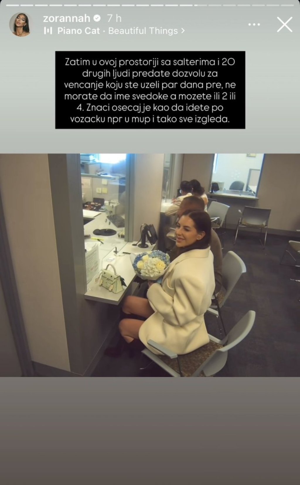 "Zatim u ovoj prostoriji sa šalterima i 20 drugih ljudi predate dozvolu za venčanje koju ste uzeli par dana pre, ne morate da ime svedoke a mozete ili 2 ili 4. Znači osećaj je kao da idete po vozačku na primer u MUP i tako sve izgleda", dodala je ona.