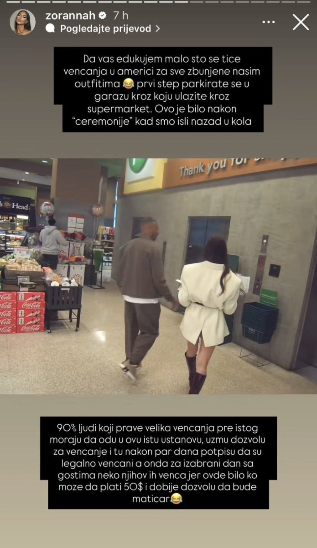 "Da vas malo edukujem što se tiče venčanja u Americi za sve zbunjene našim autfitima. Prvi korak je da se parkirate u garažu kroz koju ulazite kroz supermarket. Ovo je bilo nakon "ceremonije", kada smo išli nazad u kola. Devedeset odsto ljudi koji prave velika venčanja pre istog moraju da odu u ovu istu ustanovu, uzmu dozvolu za venčanje i tu, nakon par dana, potpišu da su legalno venčani. A onda, za izabrani dan sa gostima, neko njihov ih venča, jer ovde bilo ko može da plati 50 dolara i dobije dozvolu da bude matičar", napisala je Zorana na Instagramu i nastavila: