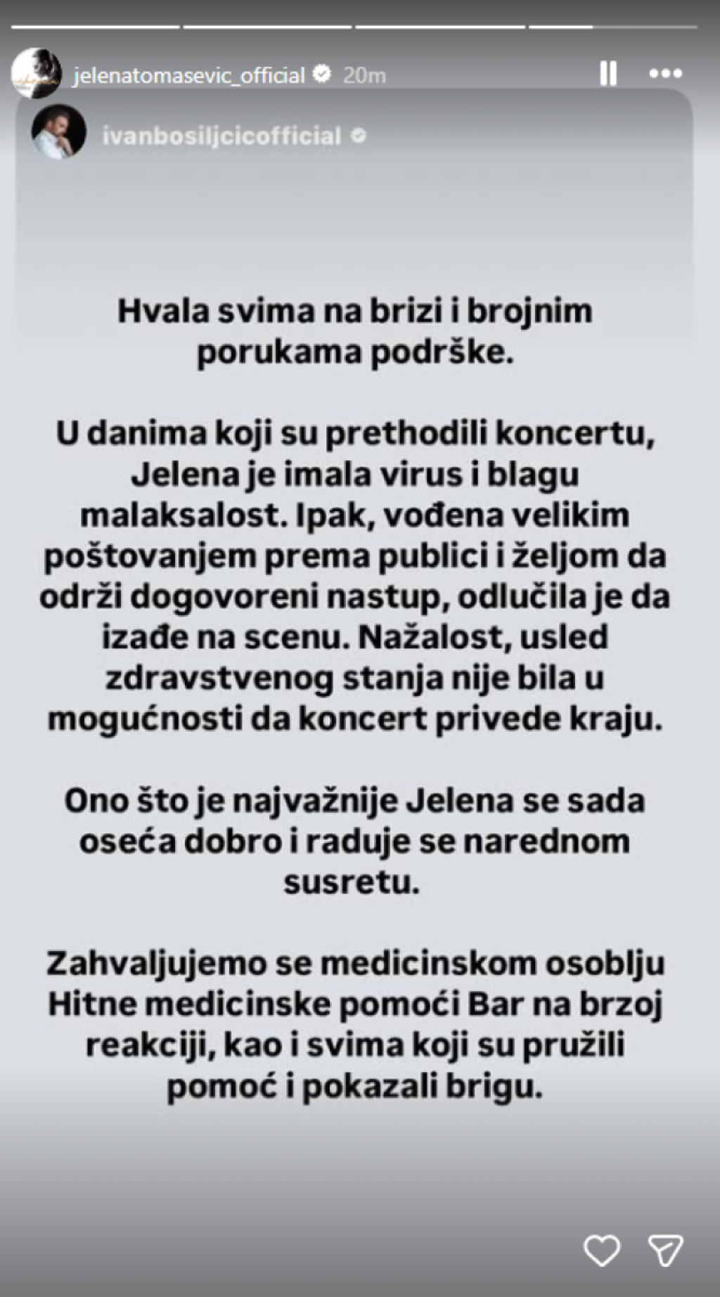 "Hvala svima na brizi i brojnim porukama podrške. U danima koji su prethodili koncertu, Jelena je imala virus i blagu malaksalost. Ipak, vođena velikim poštovanjem prema publici i željom da održi dogovoreni nastup, odlučila je da izađe na scenu. Nažalost, usled zdravstvenog stanja nije bila u mogućnosti da koncert privede kraju. Ono što je najvažnije Jelena se sada oseća dobro i raduje se narednom susretu sa publikom", navodi se u saopštenju njenog tima.