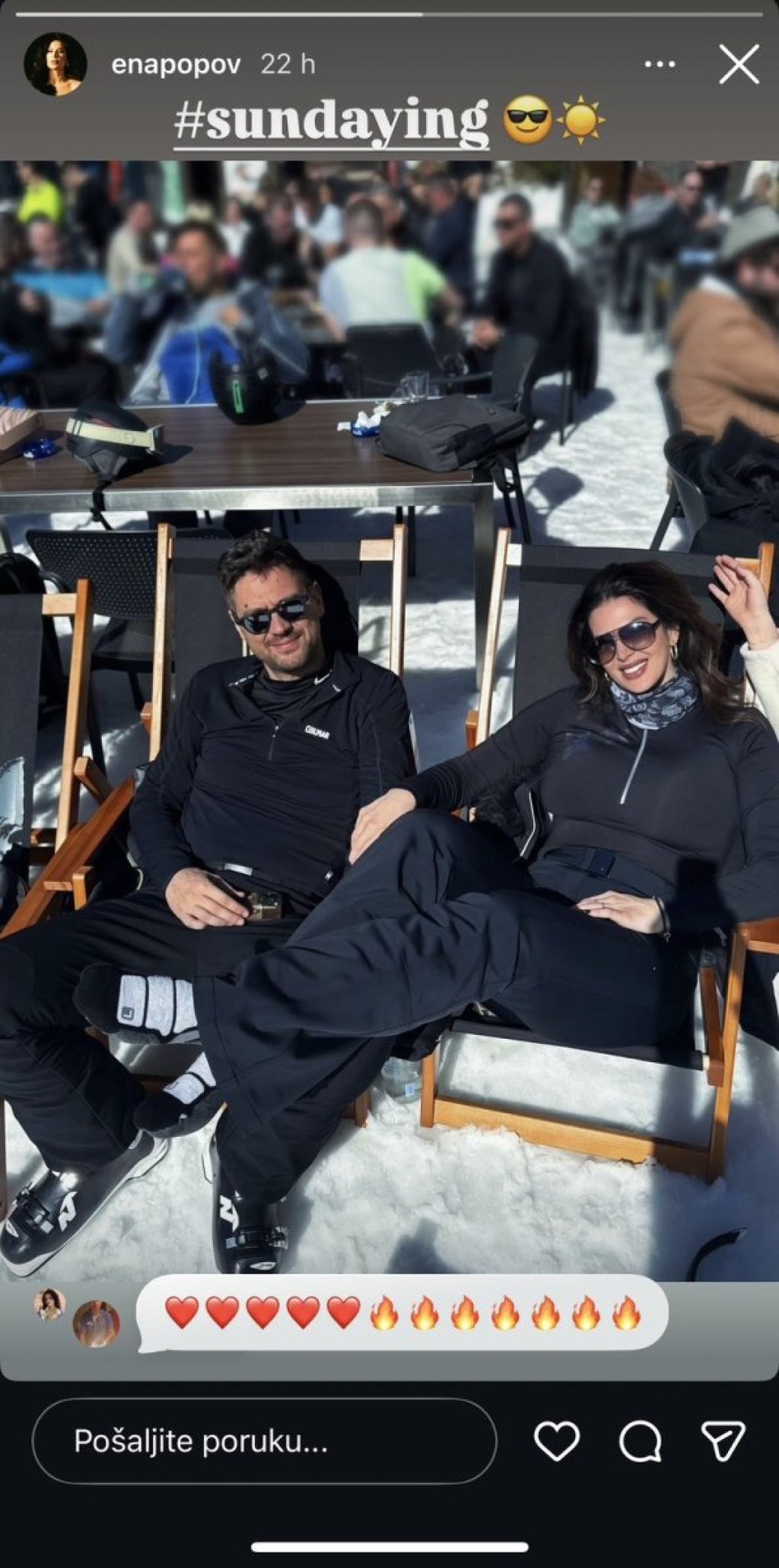 Pevačica i biznismen nisu skidali osmehe sa lica dok su sedeli zavaljeni u ležaljkama na skijanju.