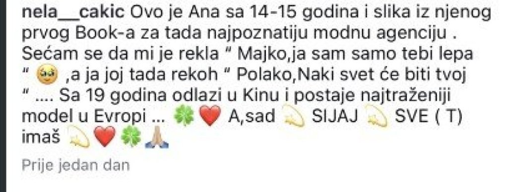 "Ovo je Ana sa 14-15 godina i slika iz njenog prvog buka, za tada najpoznatiju modnu agenciju. Sećam se da mi je rekla: "Majko, ja sam samo tebi leka", a ja joj tada rekoh: "Polako, Naki, svet će biti tvoj". Sa 19 godina odlazi u Kinu i postaje najtraženiji model u Evropi. A sad sijaj, sve(t) imaš", poručila je Cakićka.