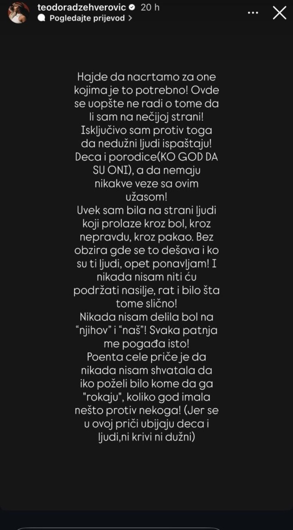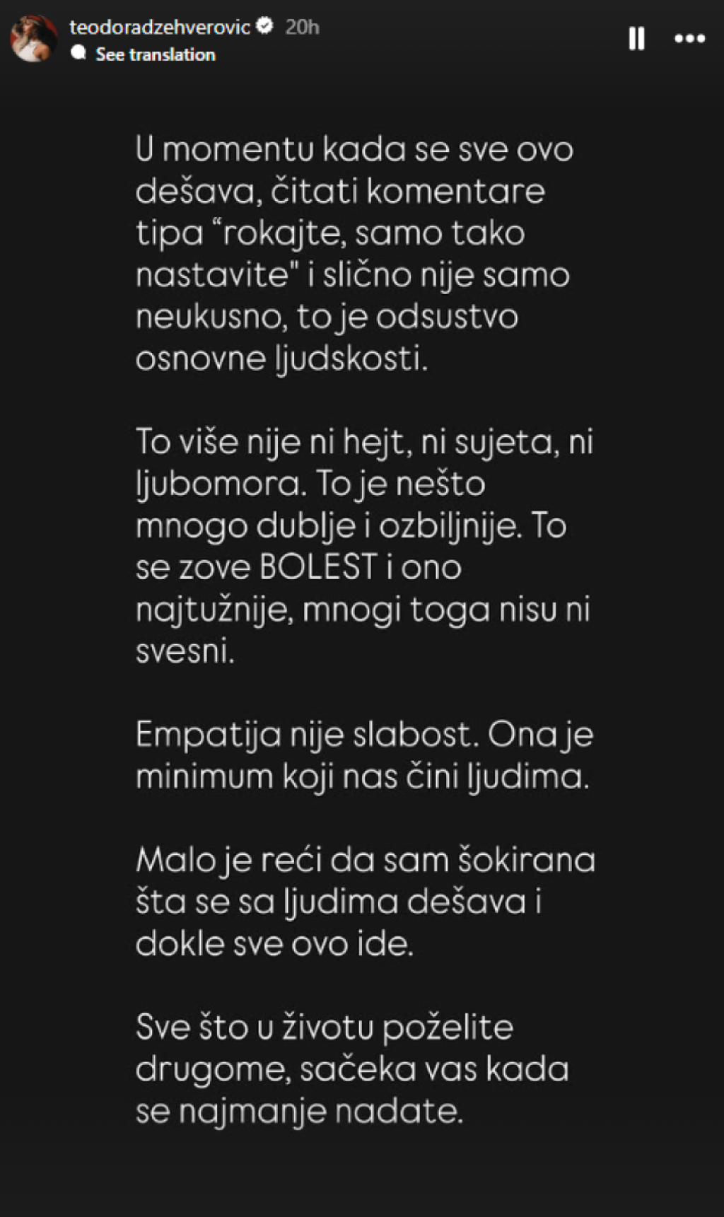 "U momentu kada se sve ovo dešava, čitati komentare tipa 'rokajte, samo tako nastavite' i slično nije samo neukusno, to je odsustvo osnovne ljudskosti. To više nije ni hejt, ni sujeta, ni ljubomora. To je nešto mnogo dublje i ozbiljnije. To se zove bolest i ono najtužnije, mnogi toga nisu ni svesni. Empatija nije slabost. Ona je minimum koji nas čini ljudima. Malo je reći da sam šokirana šta se sa ljudima dešava i dokle sve ovo ide. Sve što u životu poželite drugome, sačeka vas kada se najmanje nadate. Neka mir pobedi", napisala je Teodora.