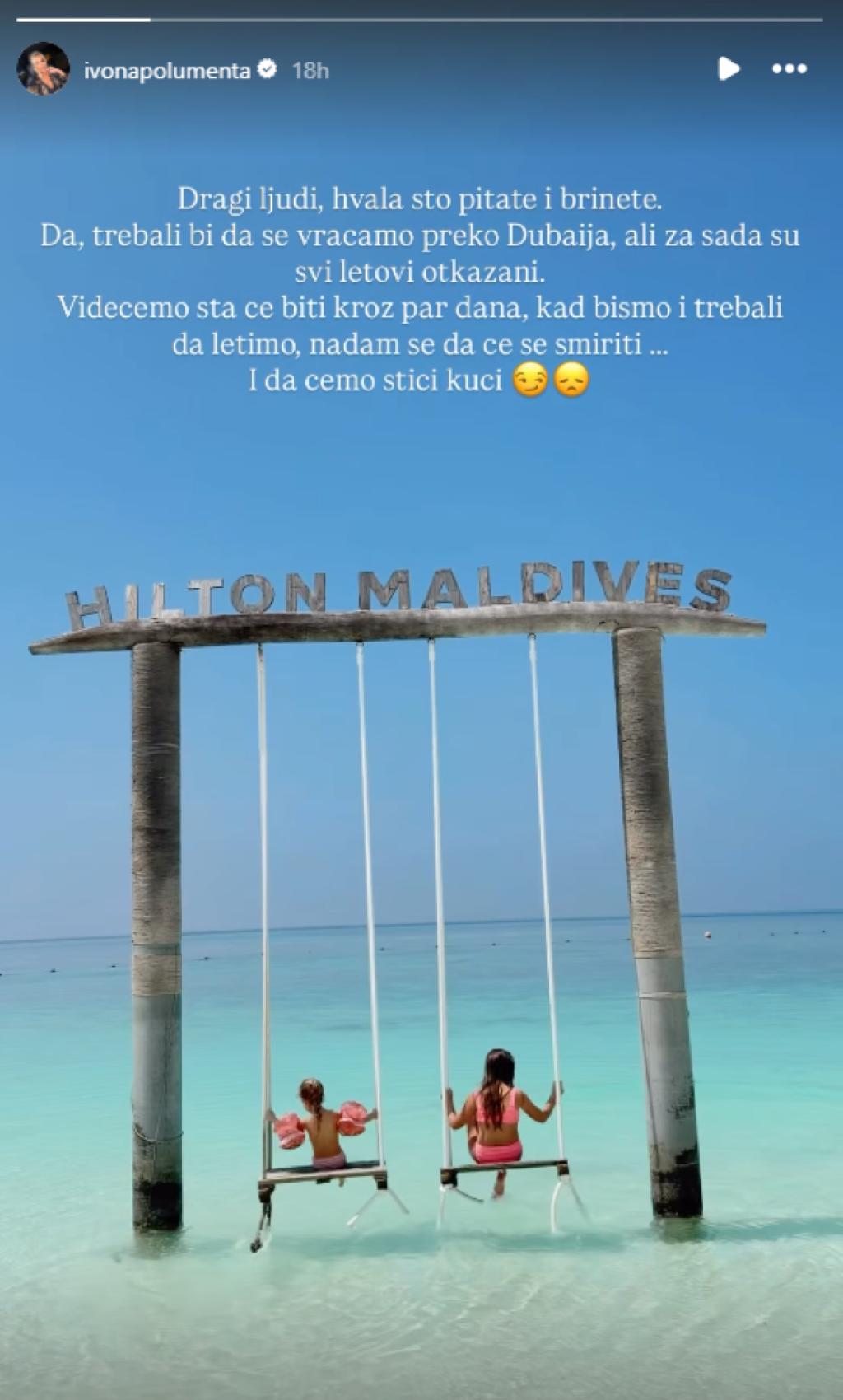 "Sve je okej sa nama, kupili smo nove karte, malo okolo, malo ćemo obići planetu, ali karte se rasprodaju brzinom svetlosti, dobro da smo i ovo uspeli. Za par dana se vraćamo kući, daj Bože", napisala je Ivona Polumenta i dodala: