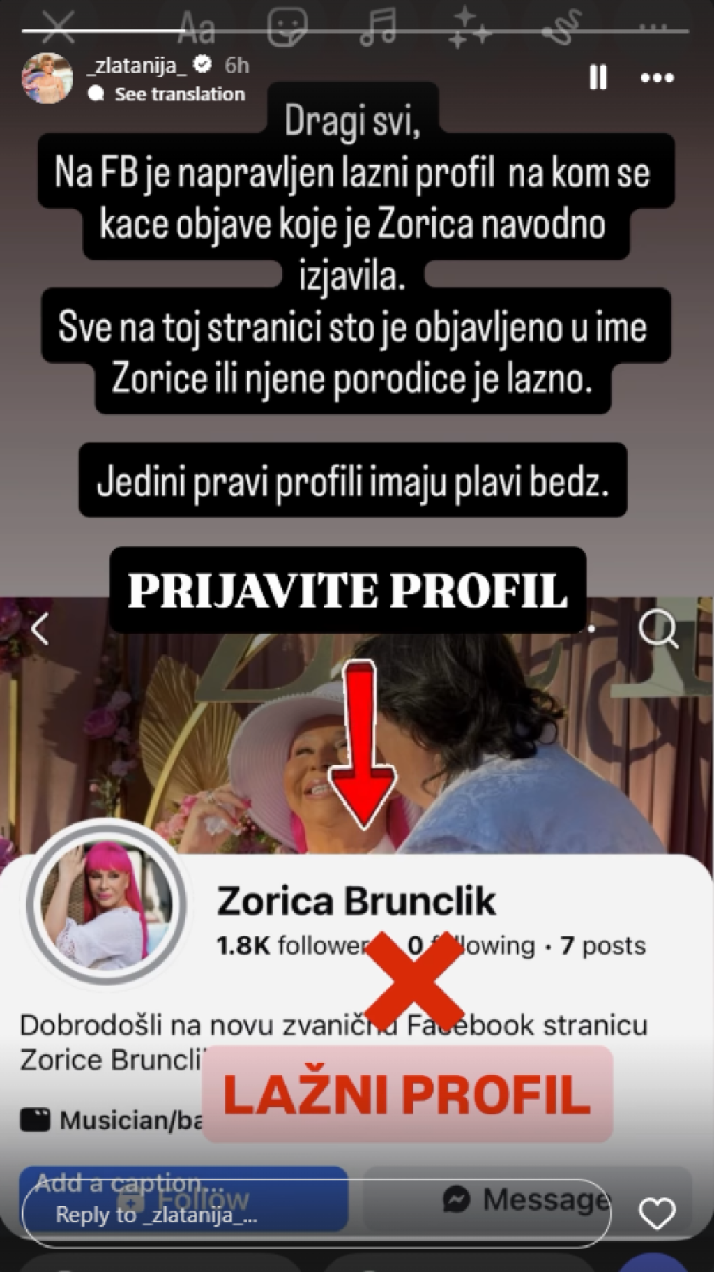 "Dragi svi, na Fejsbuku je napravljen lažni profil na kom se objavljuju izjave koje je Zorica navodno dala. Sve što je objavljeno u ime Zorice ili njene porodice je lažno. Jedini pravi profil ima plavi bedž", napisala je Zlata na svom Instagramu.