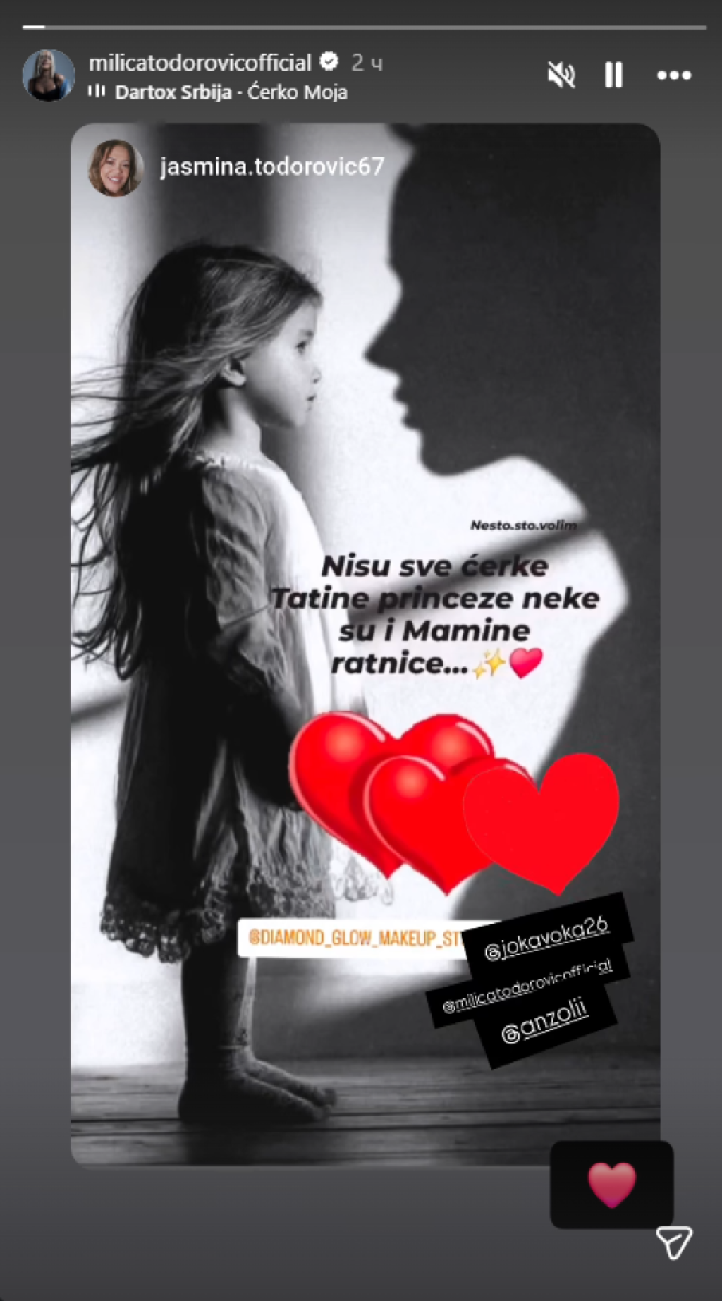 "Nisu sve ćerke tatine princeze, neke su i mamine ratnice", poručila je Jasmina, a Milica je na ovu objavu stavila srce.