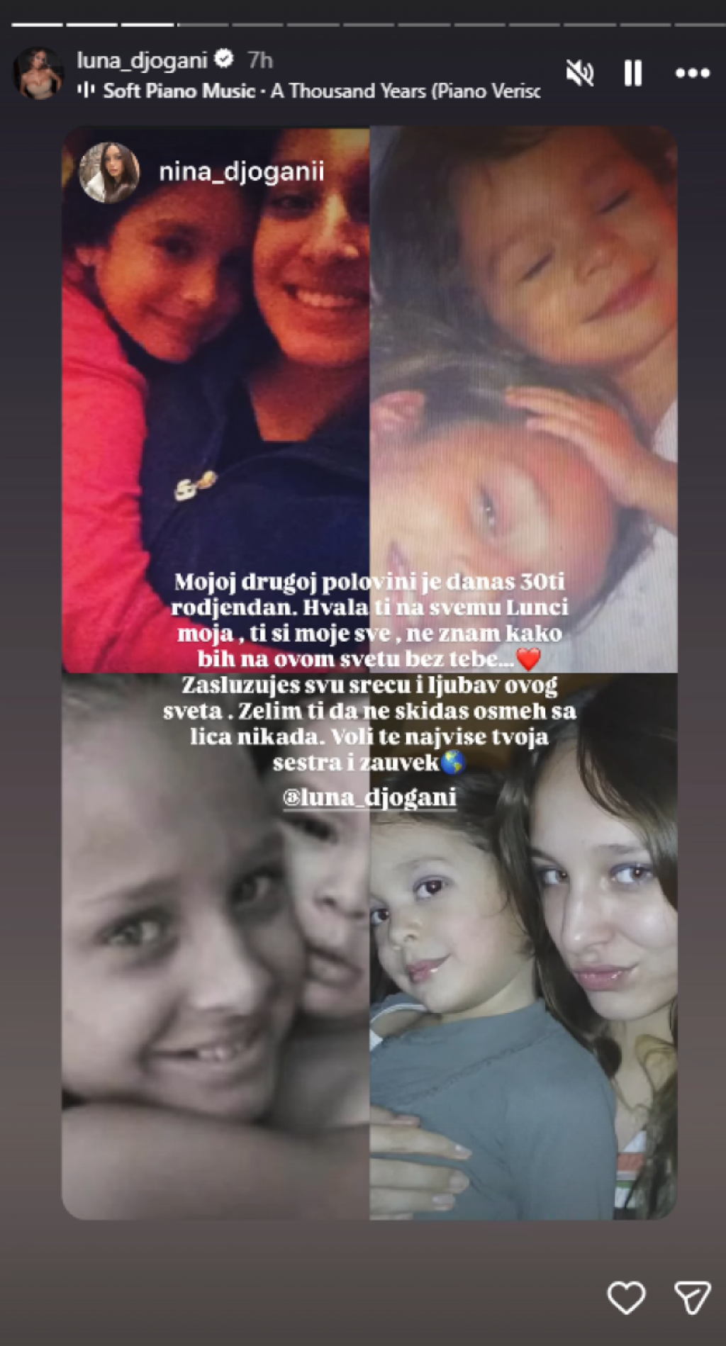 "Mojoj drugoj polovini je danas 30. rođendan. Hvala ti na svemu Lunči moja, ti si moje sve, ne znam kako bih na ovom svetu bez tebe. Zaslužuješ svu sreću i ljubav ovog sveta. Želim ti da ne skidaš osmeh sa lica nikada. Voli te najviše tvoja sestra", poručila je Nina Đogani.