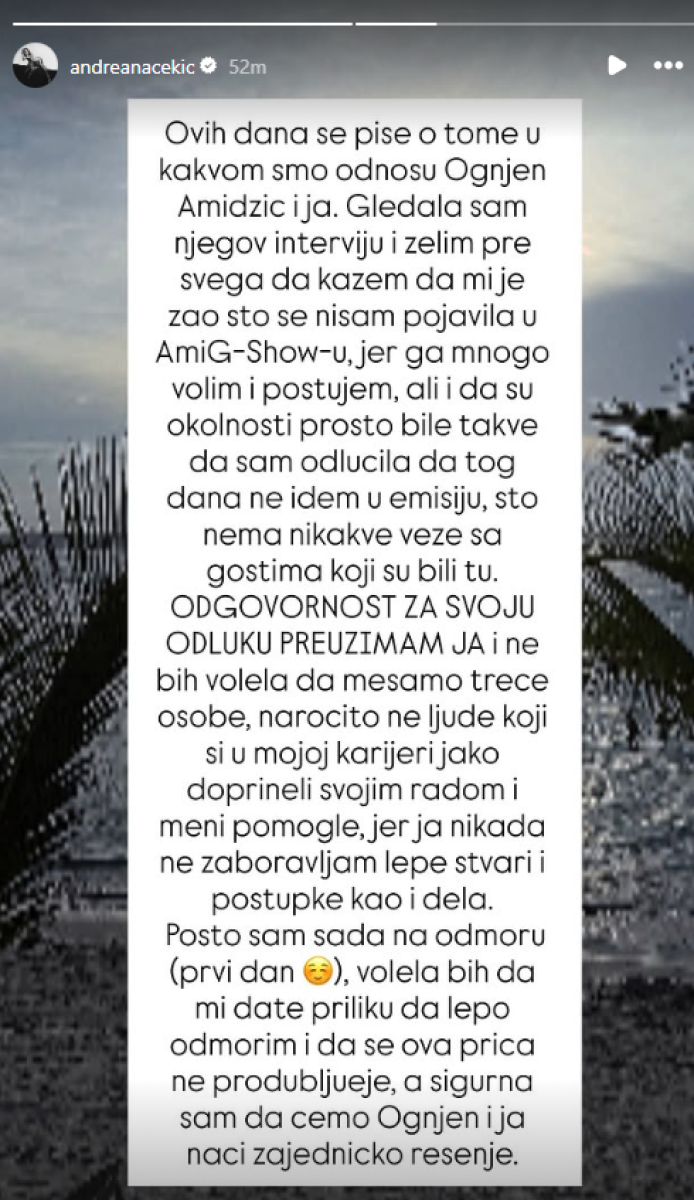 "Ovih dana se piše o tome u kakvom smo odnosu Ognjen Amidžić i ja. Gledala sam njegov intervju i želim, pre svega, da kažem da mi je žao što se nisam pojavila u "Amidži šou", jer ga mnogo volim i poštujem, ali i da su okolnosti prosto bile takve da sam odlučila da tog dana ne idem u emisiju, što nema nikakve veze sa gostima koji su bili tu", napisala je Andreana.