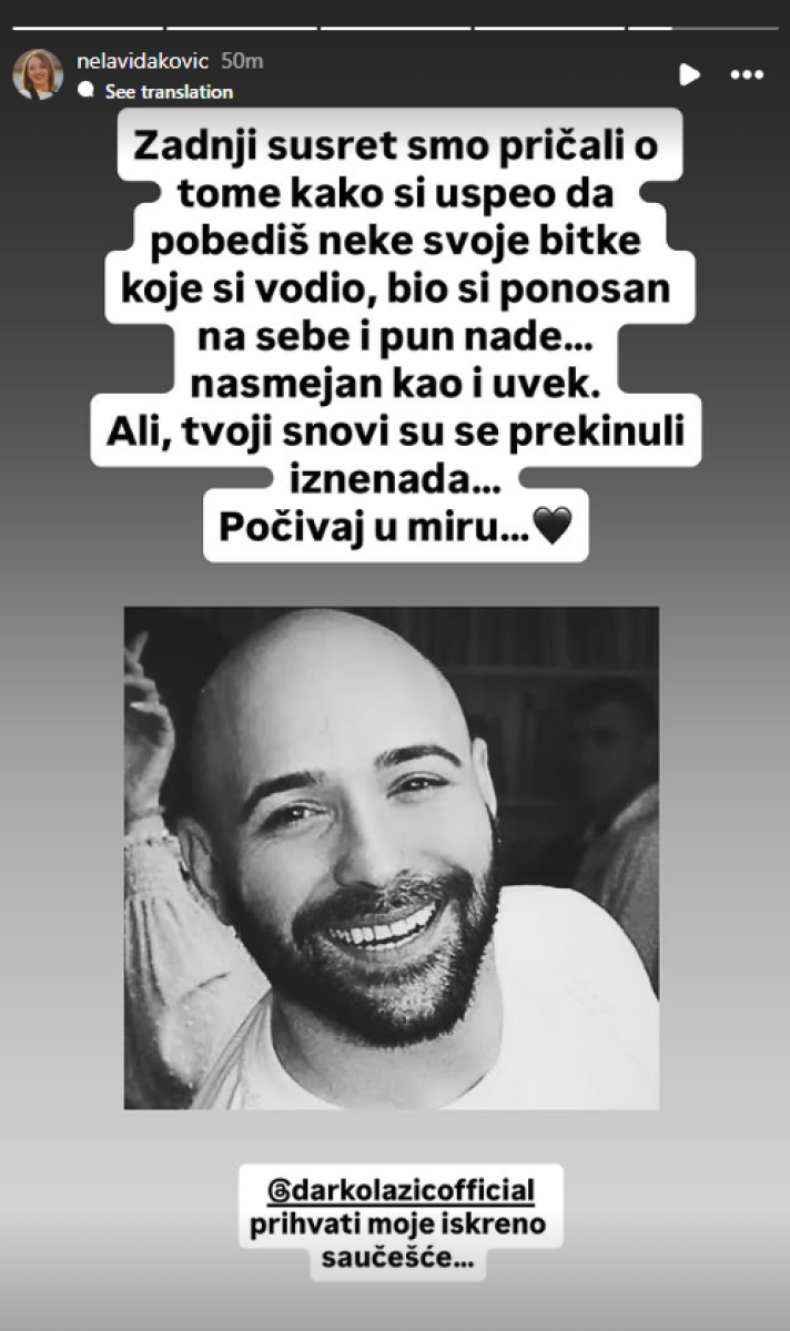 "Zadnji susret smo pričali o tome kako si uspeo da pobediš neke svoje velike bitke koje si vodio, bio si ponosan na sebe i pun nade... nasmejan kao i uvek. Ali tvoji snovi su se prekinuli iznenada... Počivaj u miru", napisala je Nela.