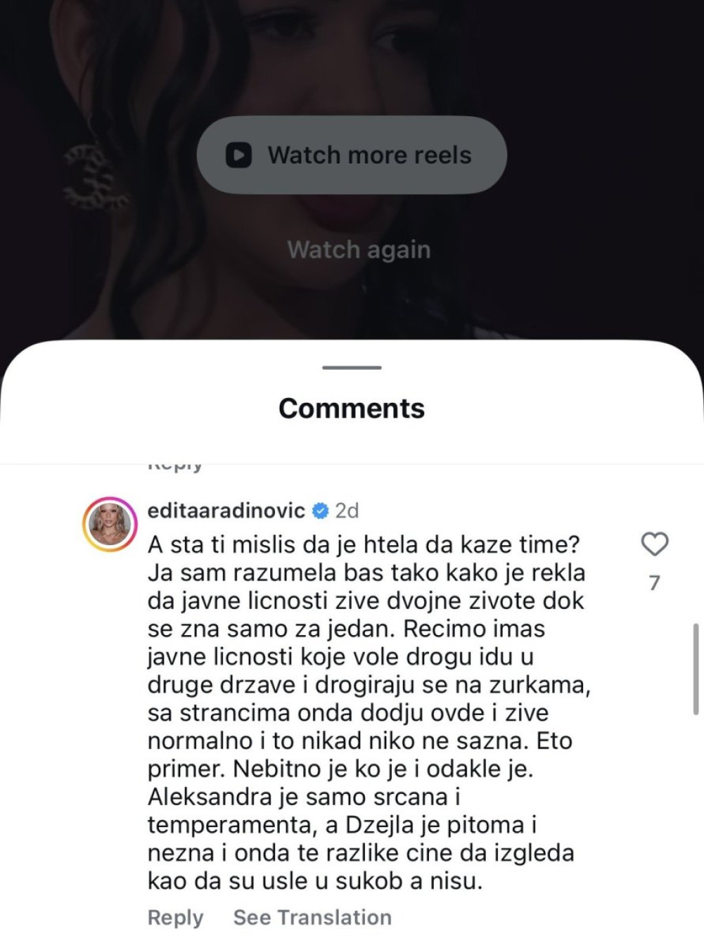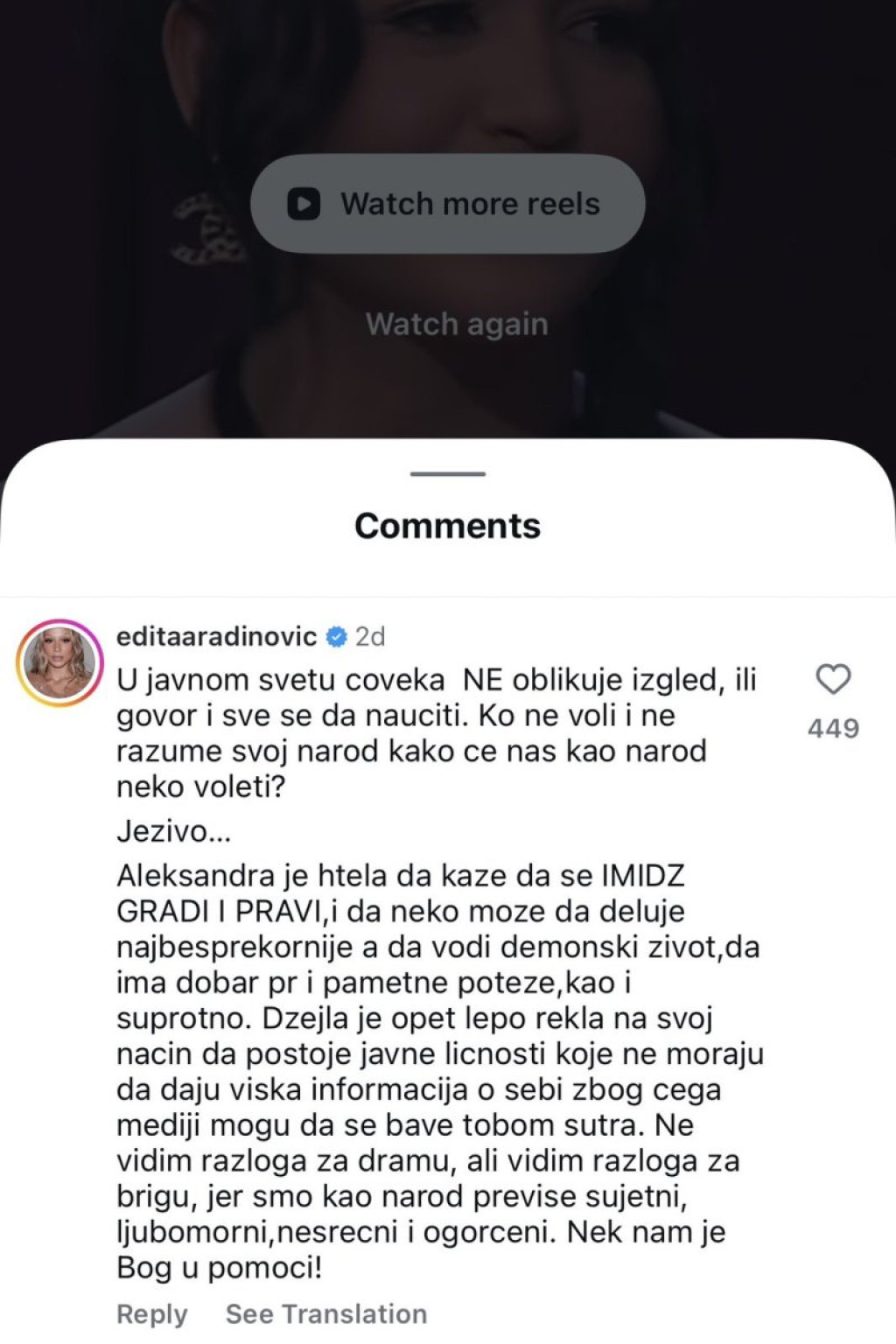 "U javnom svetu čoveka ne oblikuju samo izgled ili govor - sve se to može naučiti. Ko ne voli i ne razume svoj narod, kako će onda neko voleti nas kao narod? Jezivo... Aleksandra je htela da kaže da se imidž gradi i stvara i da neko može da deluje najbesprekornije, a da vodi demonski život, uz dobar PR i pametne poteze - ali može biti i suprotno. Džejla je, opet, na svoj način lepo rekla da postoje javne ličnosti koje ne moraju da daju višak informacija o sebi, jer mediji sutra mogu time da se bave. Ne vidim razlog za dramu, ali vidim razlog za brigu, jer smo kao narod previše sujetni, ljubomorni, nesrećni i ogorčeni. Nek nam je Bog u pomoći", napisala je Edita u komentaru ispod klipa iz "Amidžija".