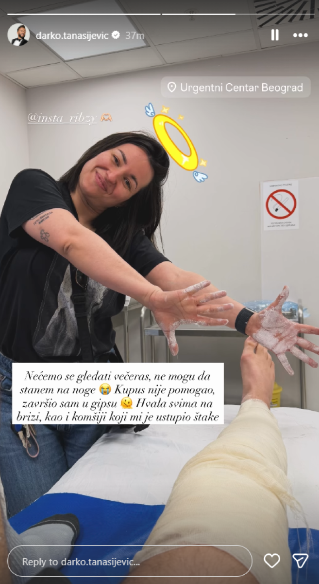 "Nećemo se gledati večeras, ne mogu da stanem na noge. Kupus nije pomogao, završio sam u gipsu. Hvala svima na brizi, kao i komšiji koji mi je ustupio štake", poručio je voditelj.