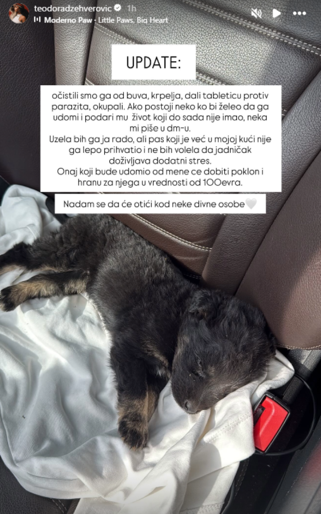 Nakon što ga je sredila i oporavila, sada želi da mu pronađe topao dom i ljude koji će mu pružiti ljubav. Na svom Instagramu podelila je dirljivu poruku i apelovala na sve koji bi želeli da udome psa i ponudila nagradu za dobro delo.