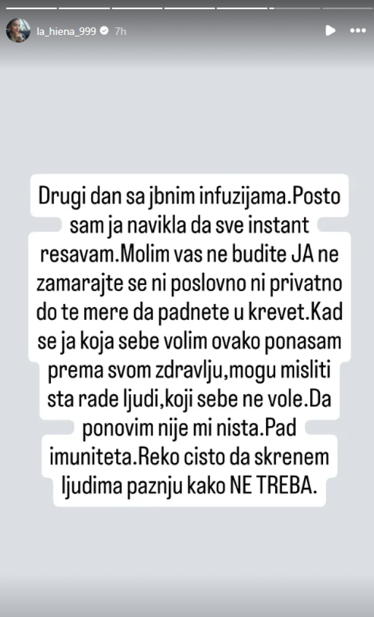 "Drugi dan sa infuzijama, pošto sam ja navikla da sve instant rešavam, molim vas ne budite ja. Ne zamarajte se ni poslovno, ni privatno, do te mere da padnete u krevet. Kad se ja, koja sebe volim, ovako ponašam prema svom zdravlju, mogu misliti šta rade ljudi koji sebe ne vole", poručila je pevačica koja je pre par dana izjavila da joj trne leva strana tela.
