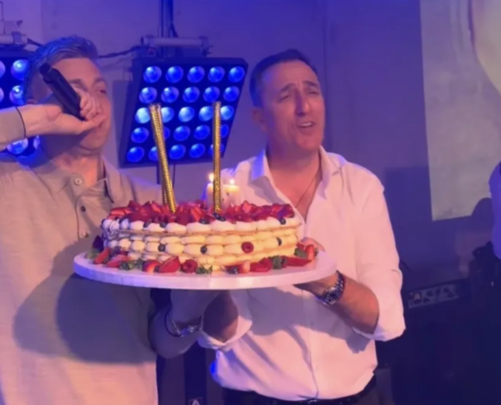 Slavljenik je imao veliku tortu sa jagodama, ukrašenu vatrometom i svećicama u broju 50, a za ovu posebnu priliku odabrao je da se elegantno obuče. Nosio je crne pantalone i belu košulju.
