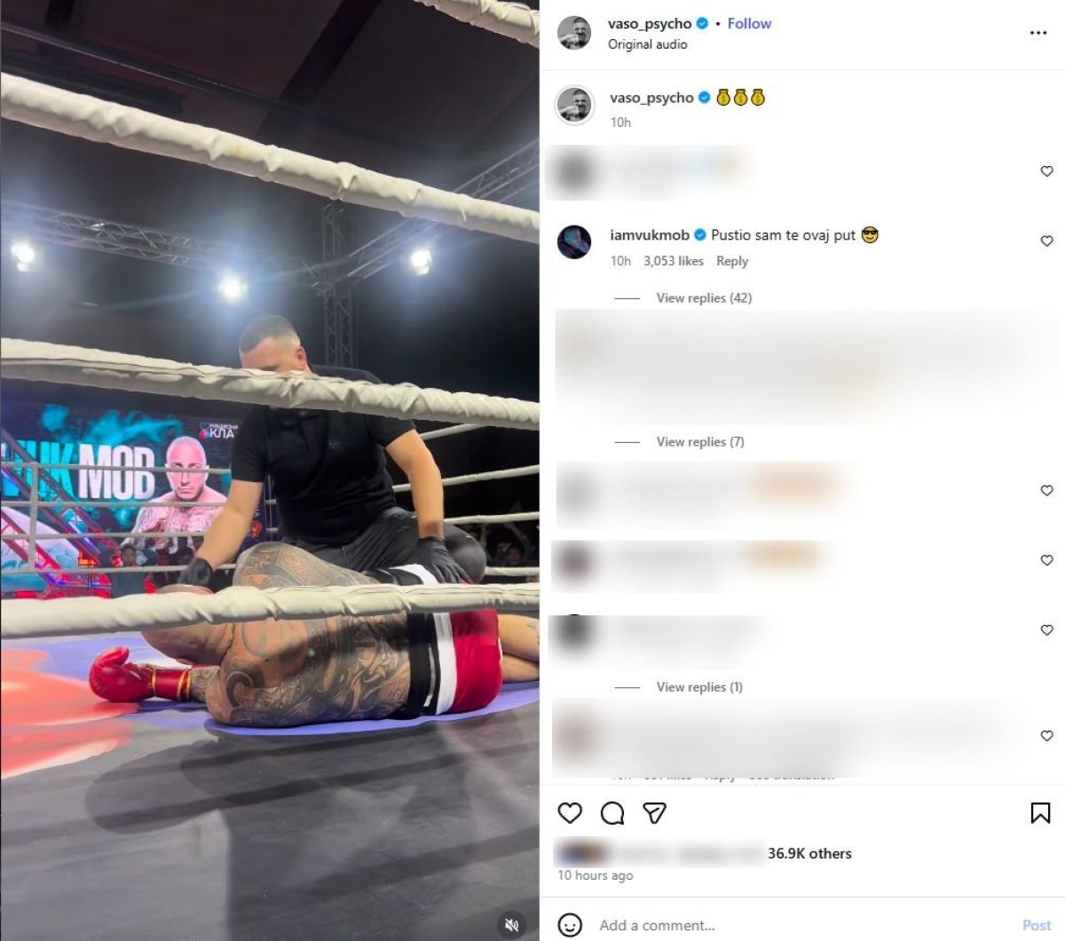Borba se završila nokautom, kada je Vaso na zemlju oborio poznatog repera. Nakon poraza koji je Vuk ponosno prihvatio, on se sada oglasio uz komentar na Bakočevićevoj objavi.