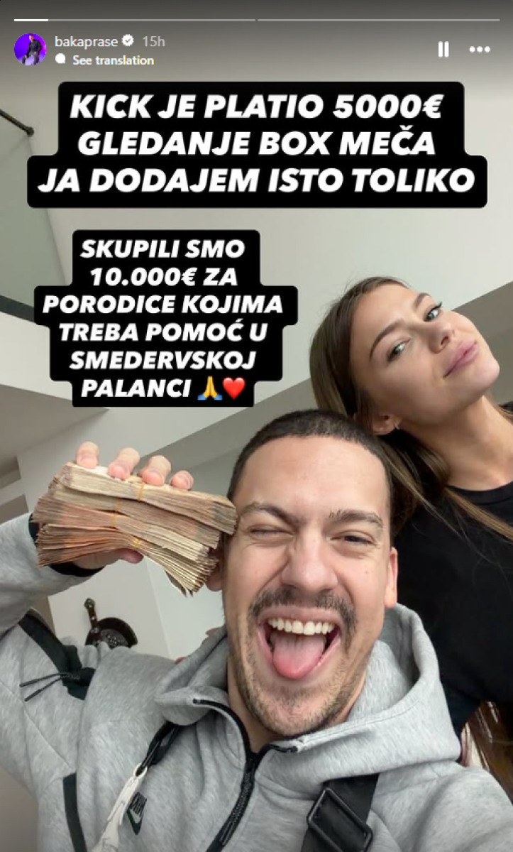 "Kick je platio 5.000 evra gledanje boks meča, ja dodajem isto toliko. Skupili smo 10.000 evra za porodice kojima treba pomoć u Smederevskoj Palanci", napisao je on putem svog Instagram profila.