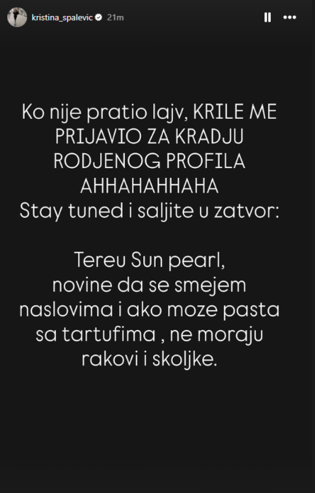 "Ko nije pratio lajv, Krile me prijavio za krađu rođenog profila", napisala je Kristina i napravila spisak stvari koje želi da joj se pošalju ako "zaglavi" u zatvoru.