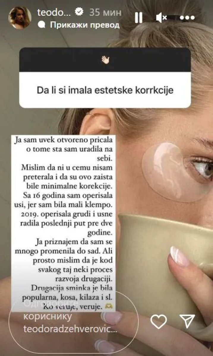 "Ja sam uvek otvoreno pričala šta sam radila na sebi. Mislim da ni u čemu nisam preterala i da su ovo zaista bile minimalne korekcije. Sa 16 godina sam operisala uši, jer sam bila mali klempo. 2019. sam operisala grudi, usne sam poslednji put radila pre dve godine", odgovorila je pevačica koja je svesna svoje fizičke promene.