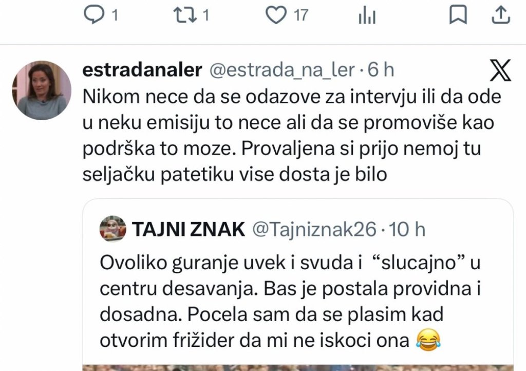 "Nikome neće da se odazove za intervju ili da ode u neku emisiju, to neće. Ali da se promoviše kao podrška, to može. Provaljena si, Prijo, nemoj tu seljačku patetiku više, dosta je bilo", glasio je komentar.