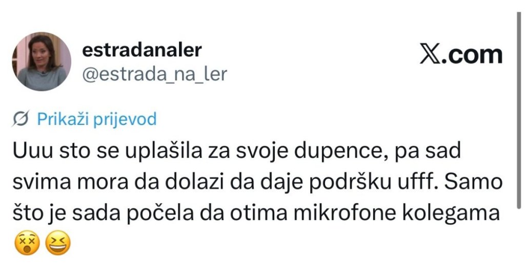 "Uu, što se uplašila za svoje dupence, pa sad svima mora da dolazi da daje podršku, uff... Samo što je sada počela da otima mikrofone kolegama", stoji u tvitu.