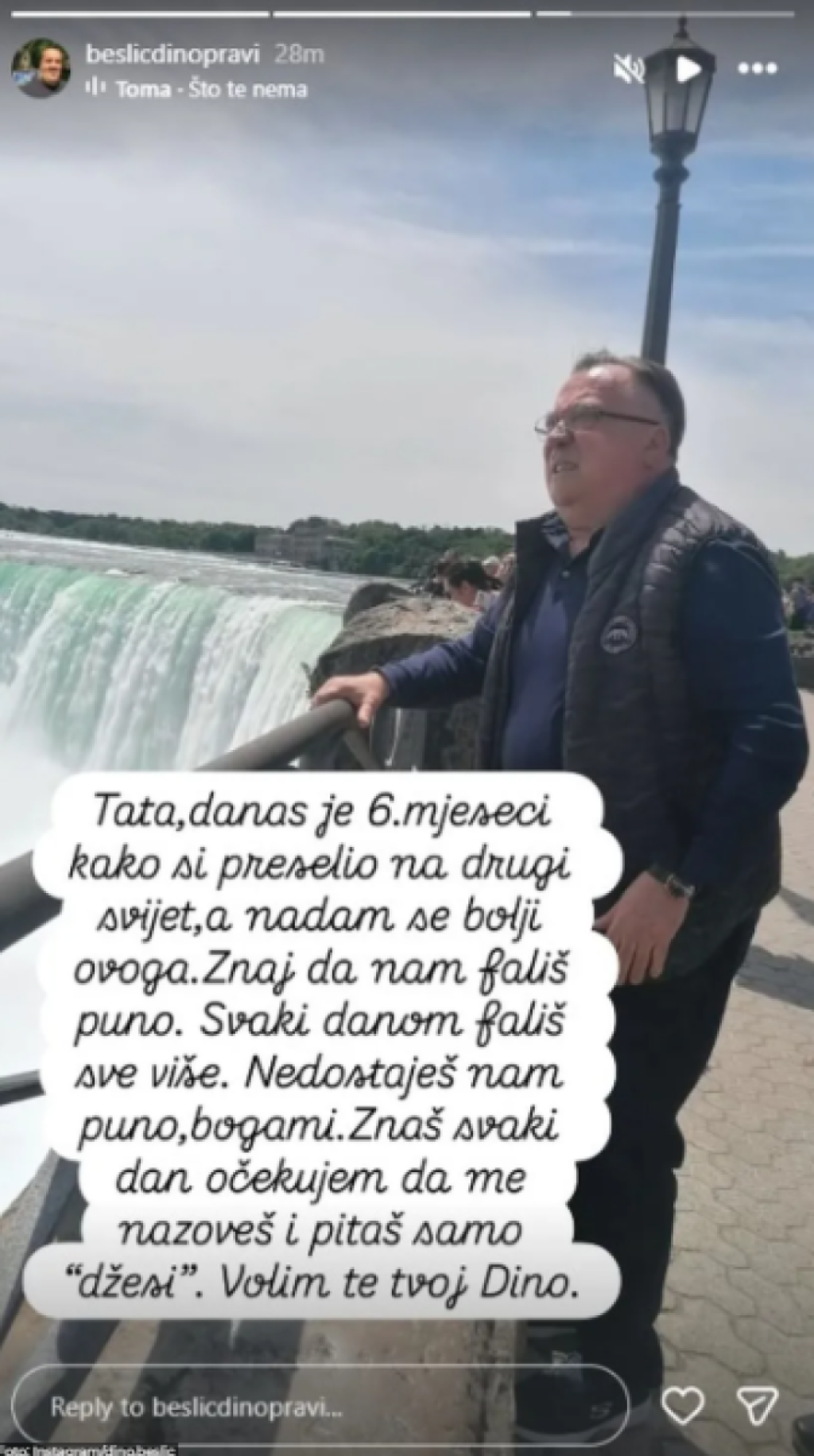 "Tata, danas je šest meseci kako si se preselio na drugi svet, a nadam se bolji od ovog. Znaj da nam fališ puno. Svaki dan fališ sve više. Nedostaješ nam puno, bogami. Znaš, svaki dan očekujem da me nazoveš i pitaš samo 'džesi'. Volim te, tvoj Dino", napisao je Dino Bešlić.