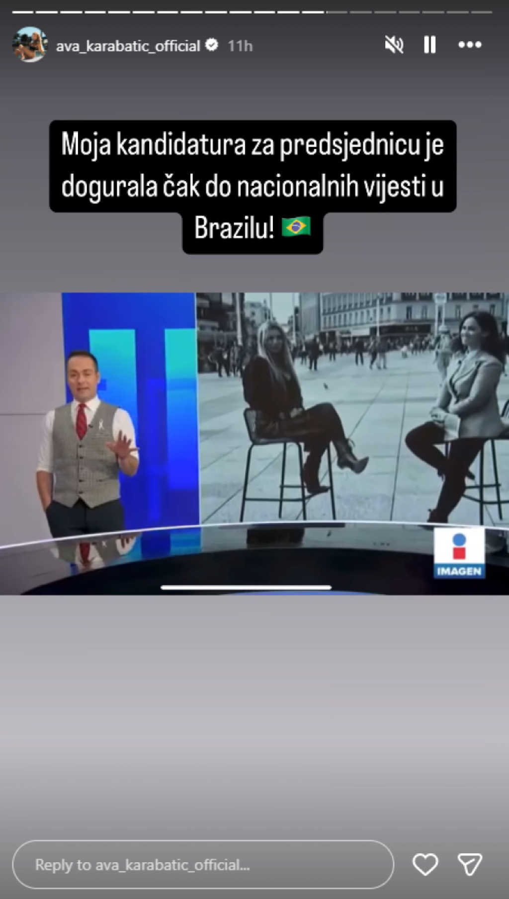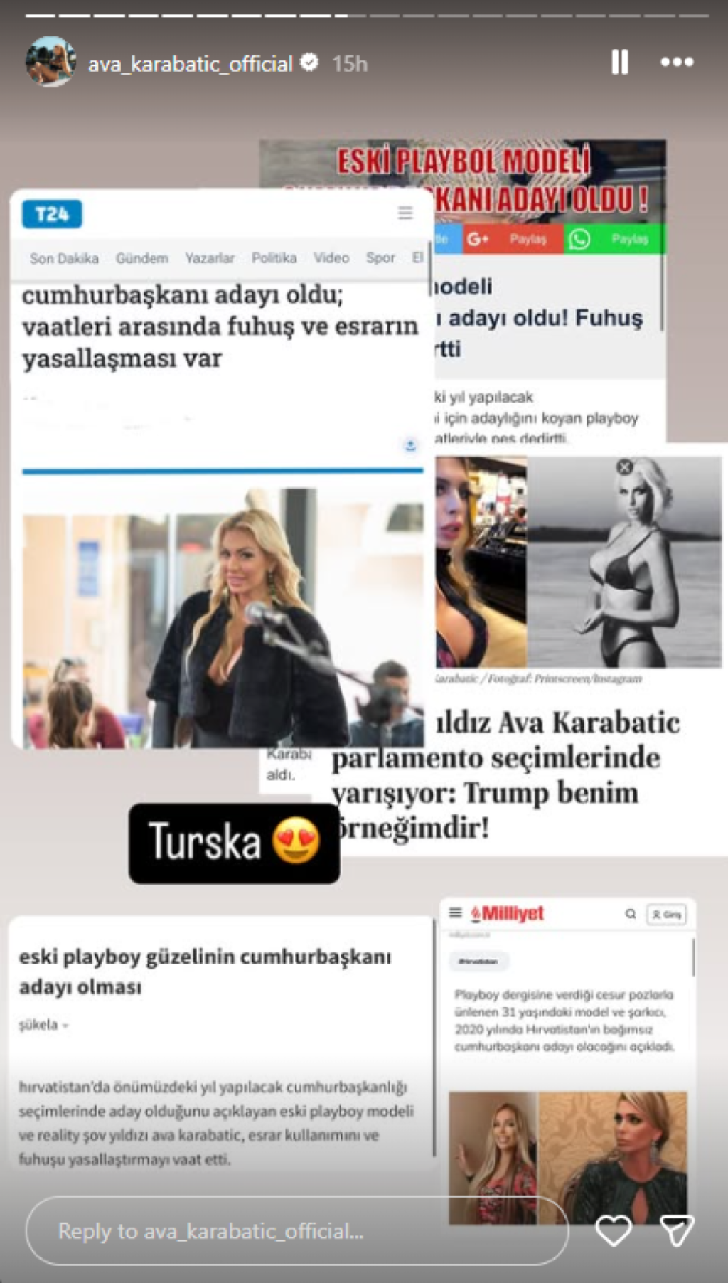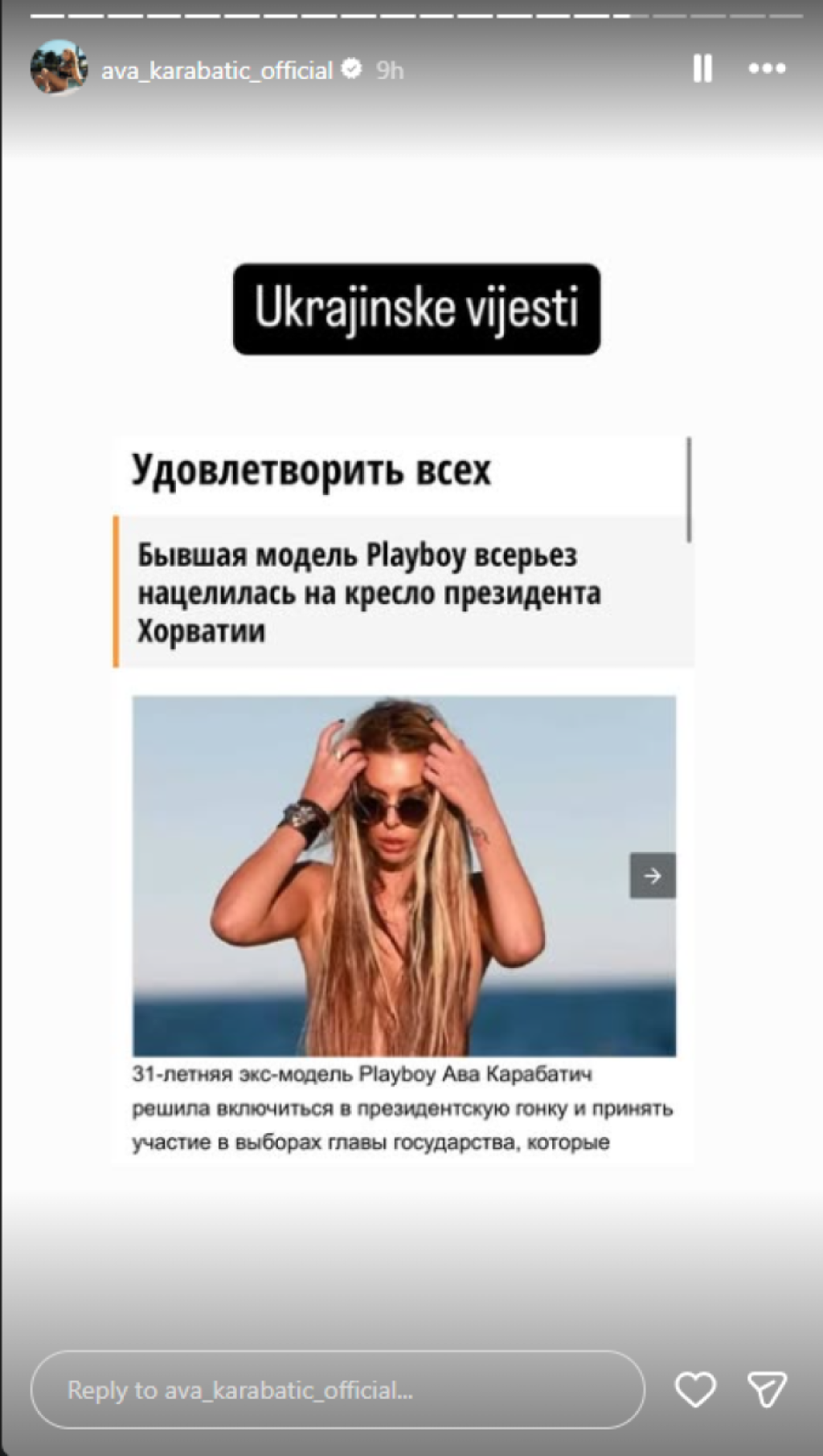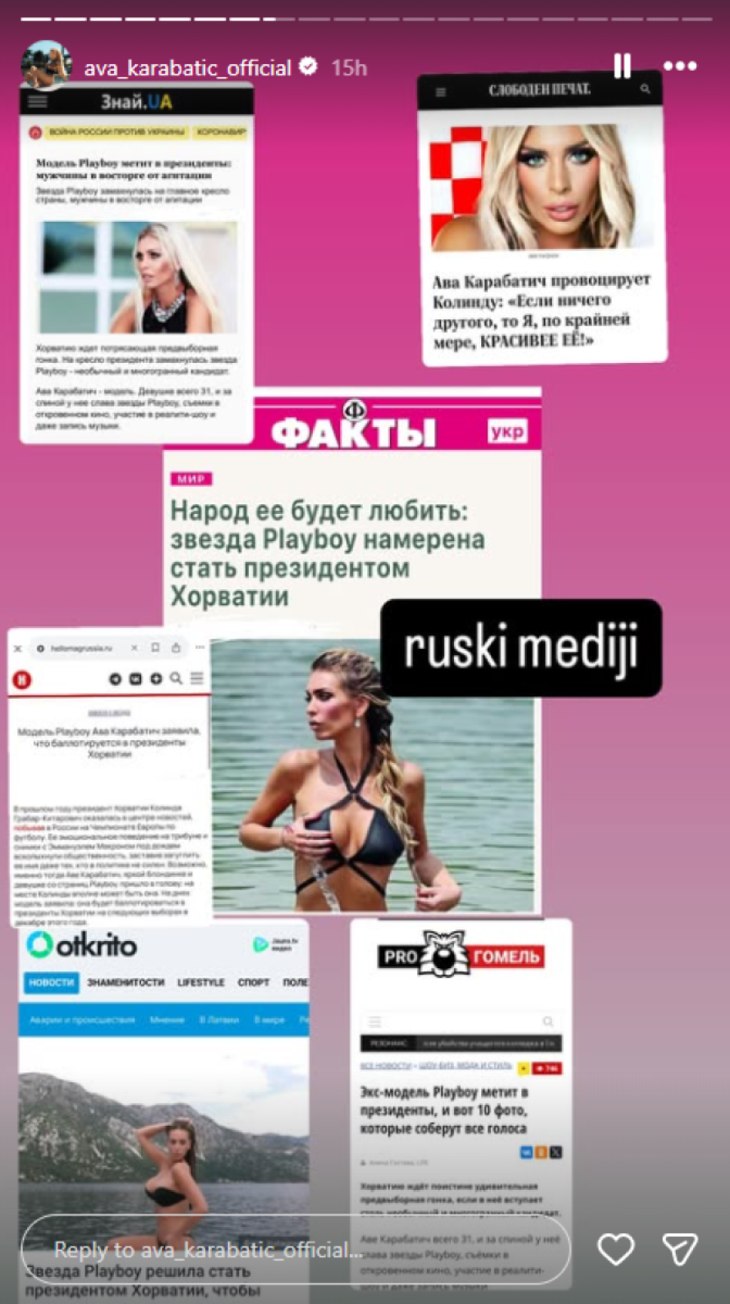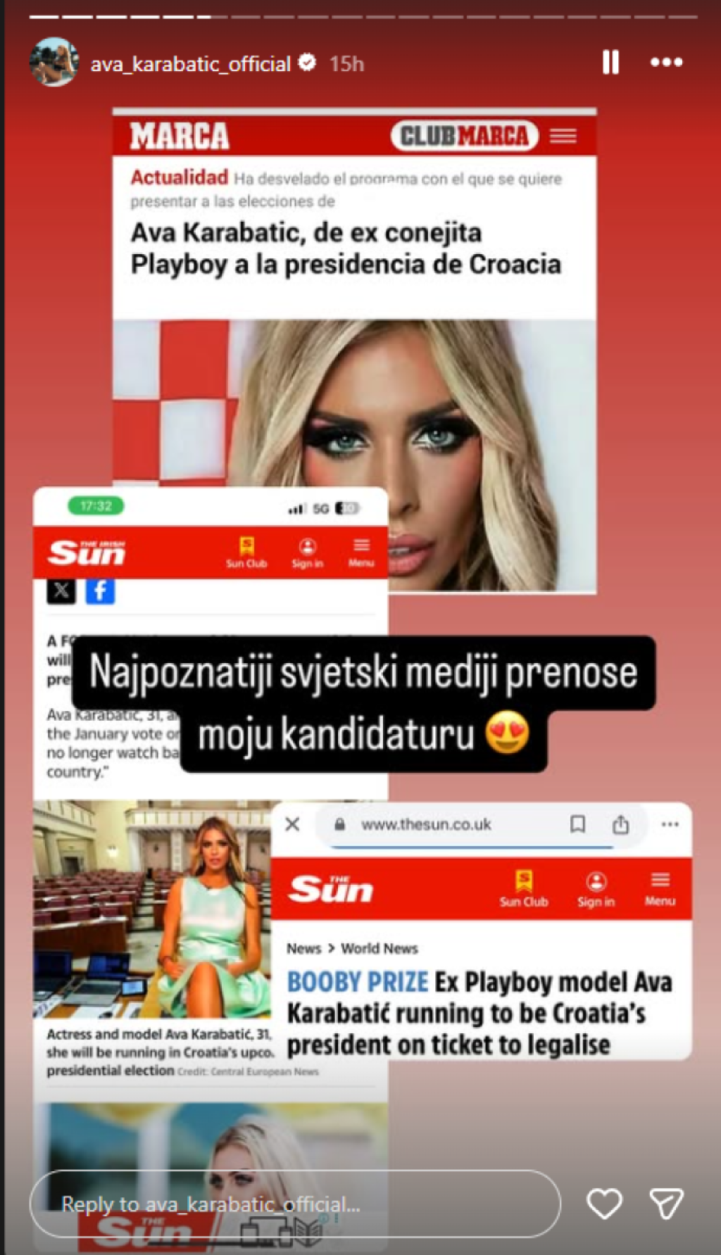 Starleta i rijaliti učesnica Ava Karabatić najavila je kandidaturu za predsednicu Hrvatske i pohvalila se da o njoj pišu u svetski mediji.