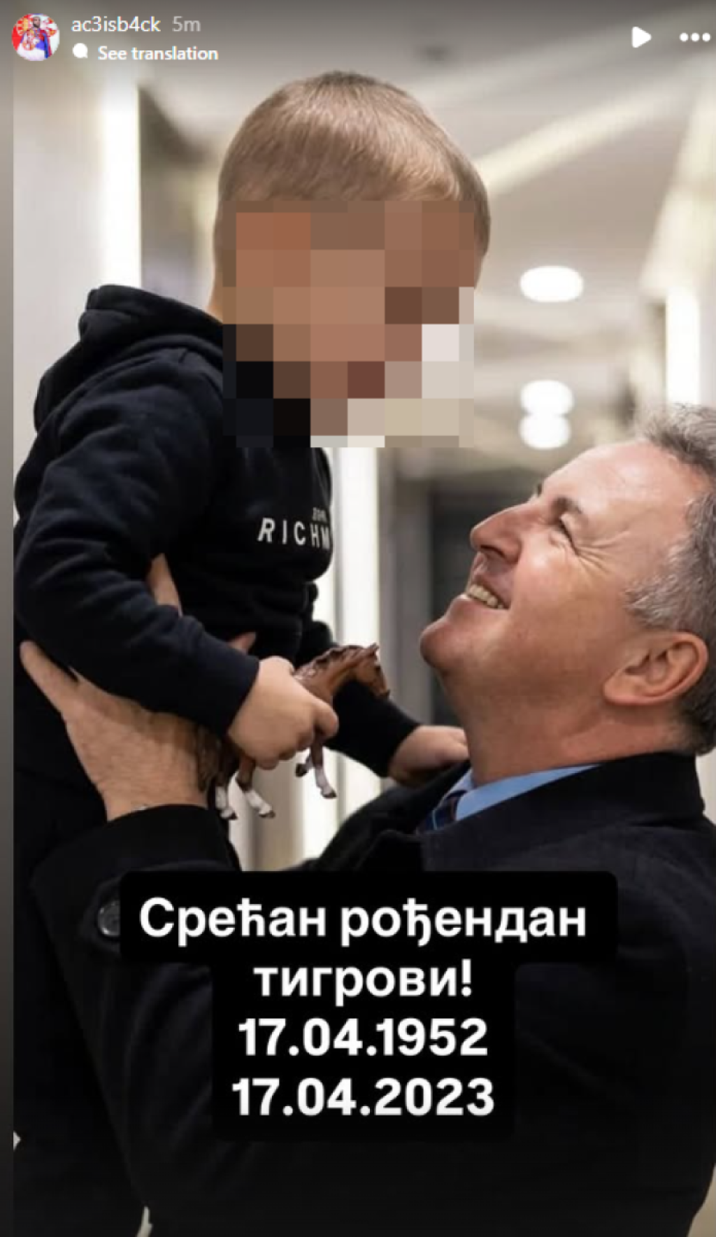 Veljko je na Instagram okačio fotografiju, napravljenu uz pomoć veštačke inteligencije, na kojoj njegov pokojni otac Željko Ražnatović Arkan, drži u rukama unuka Krstana, koji je rođen na isti datum kad i on.