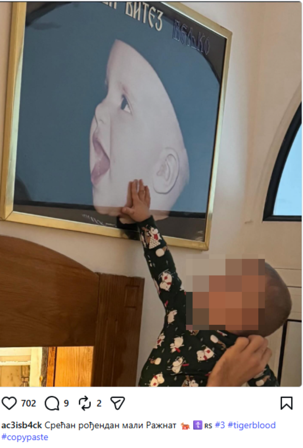 Ražnatović je potom okačio i sliku na kojoj njegov srednji sin gleda u njegovu sliku, okačenu na zidu, kad je bio mali. Sličnost između Krstana i Veljka je neverovatna, a bokser je u opisu iste napisao: "Tatina kopija".