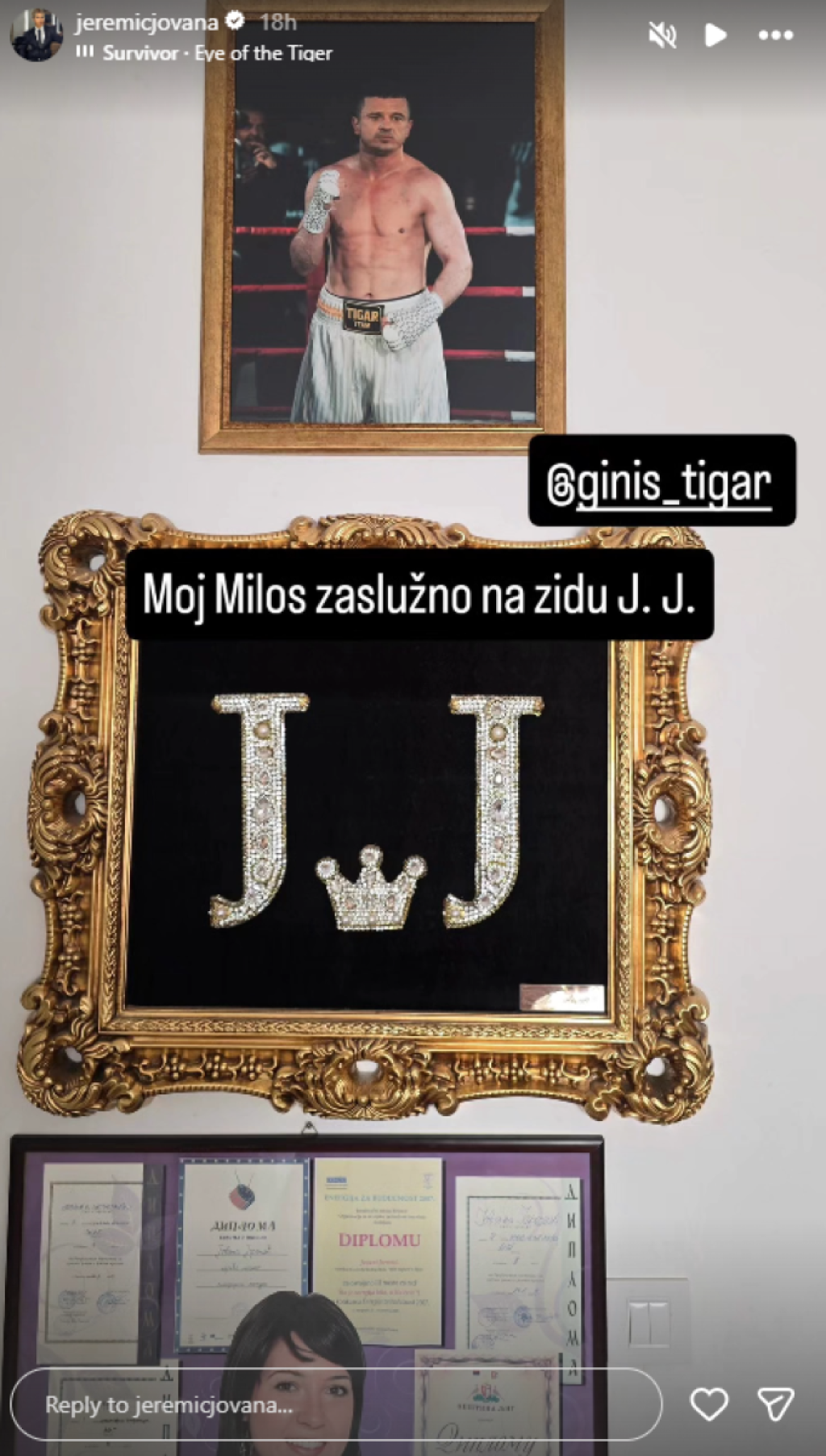 Voditeljka je podelila na društvenim mrežama detalj sa zida u svom stanu, gde je, pored diploma i inicijala, centralno mesto zauzela fotografija njenog emotivnog partnera Miloša Stojanovića poznatijeg kao Tigar.