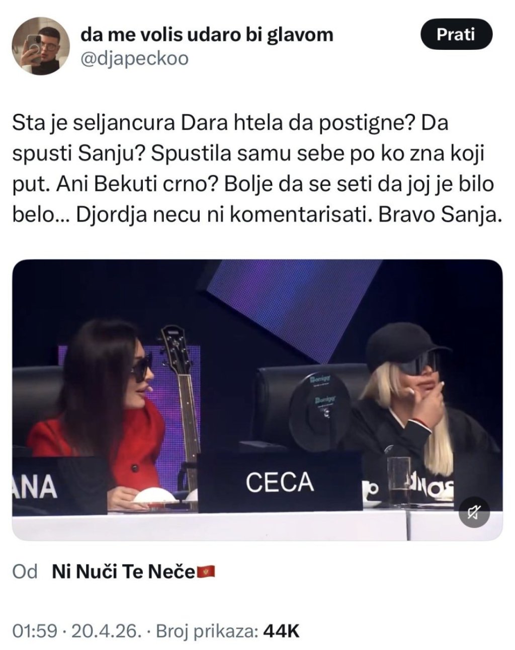 "Šta je seljančura Dara htela da postigne? Da spusti Sanju? Spustila je samu sebe po ko zna koji put", glasio je jedan komentar na mreži "X".