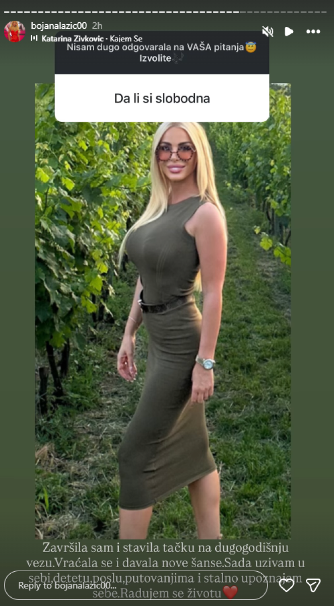 "Završila sam i stavila tačku na dugogodišnju vezu. Vraćala se i davala nove šanse. Sada uživam u sebi, detetu, poslu, putovanjima i stalno upoznajem sebe. Radujem se životu", napisala je Bojana.