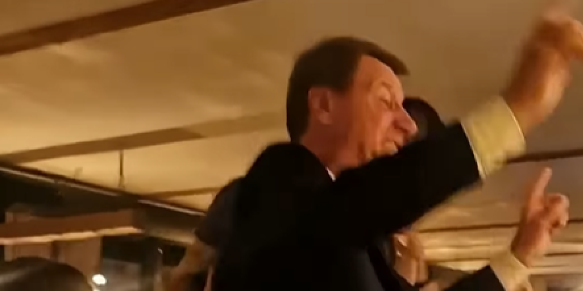 Sa njim u društvu je i legendarni košarkaš Zoran Moka Slavnić, koji se u transu popeo na stolicu i sve vreme pevao i igrao.