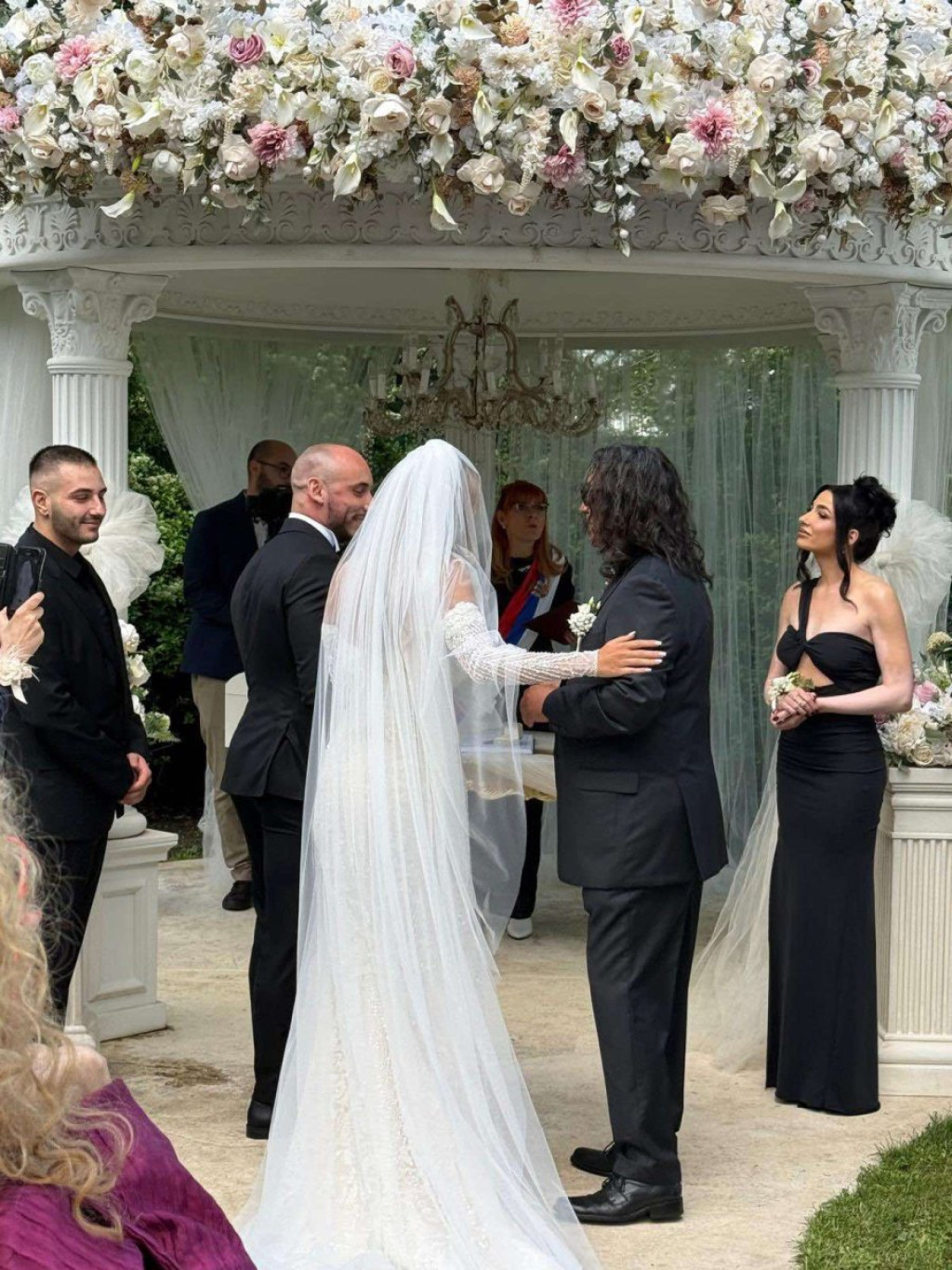 Tea je blistala u predivnoj venčanici od čipke i kristala, dok se njen suprug pojavio u crnom smokingu. Pevačicu je do matičara i budućeg supruga ispratio njen otac Zoran Tairović.
